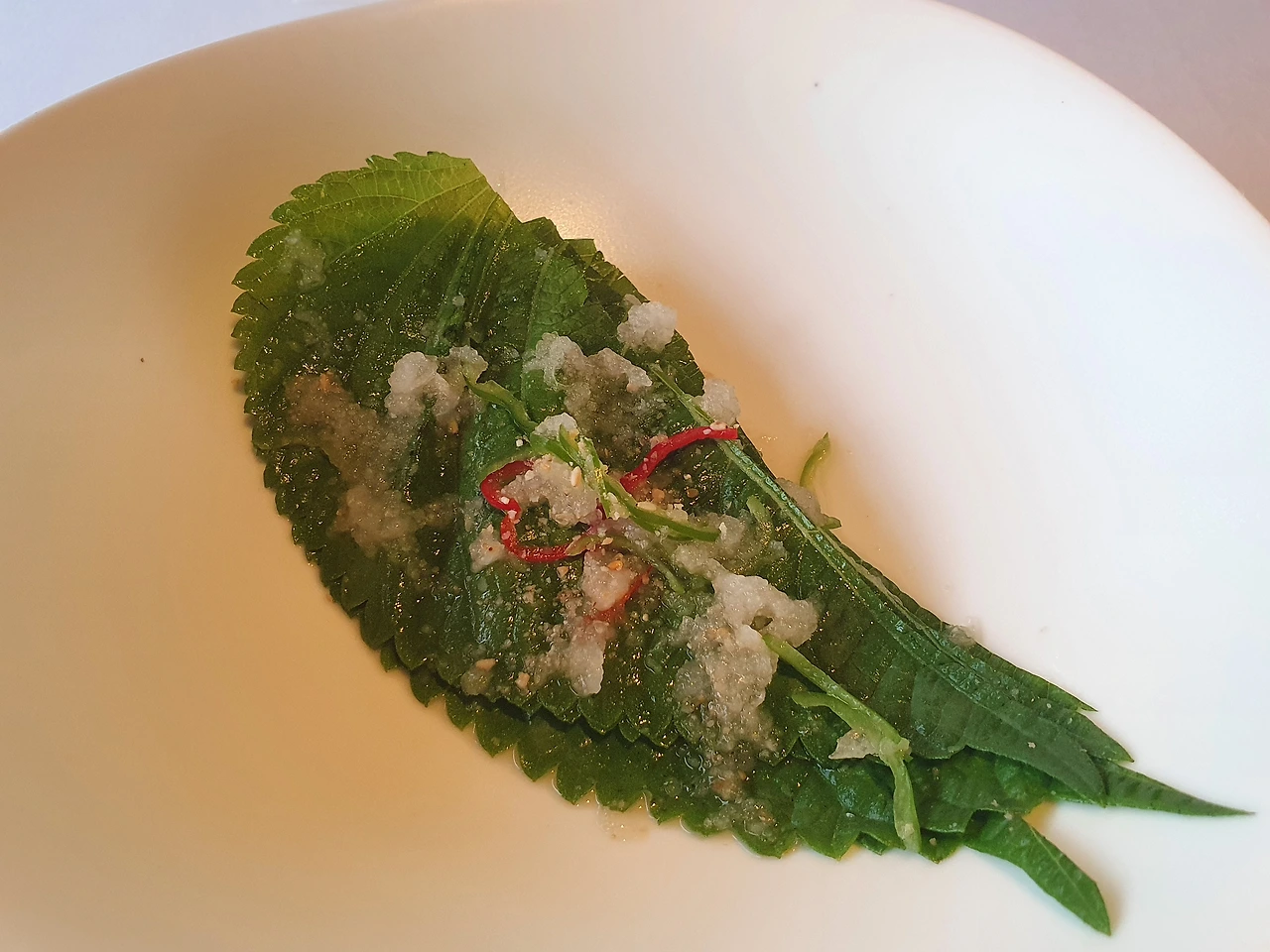 . 그리고 같이 나온 깻잎. 배 간 것과 2002년에 담근 매실액으로 맛을 냈단다. 보통 고기랑 곁들이는 깻잎은 생이거나 풀을 죽여 장아찌로 내는데, 생생한 깻잎을 살짝 마리네이드 해서 낸 게 새로웠다.한식 파인 다이닝에 오면 이런 미묘한 변주를 캐치할 수 있어 좋다.