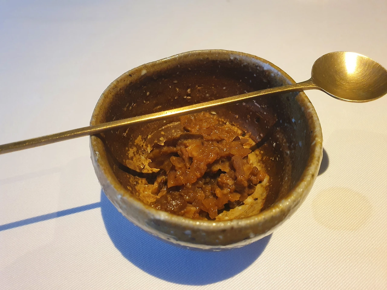 . 원래도 좋아하는 삼양춘이 회의 페어링 술로 나왔다. 서버분의 설명에 따르면 젓갈과 장맛이 찹쌀로 빚어 달콤한 삼양춘과 잘 어울린다고 했다. 보통 회는 소주나 화이트 와인과 먹는 걸 선호하지만, 젓갈에 무친 회는 맛이 강해서 이렇게 달콤하고 진한 탁주로 조금 눌러주는 것도 좋았다.