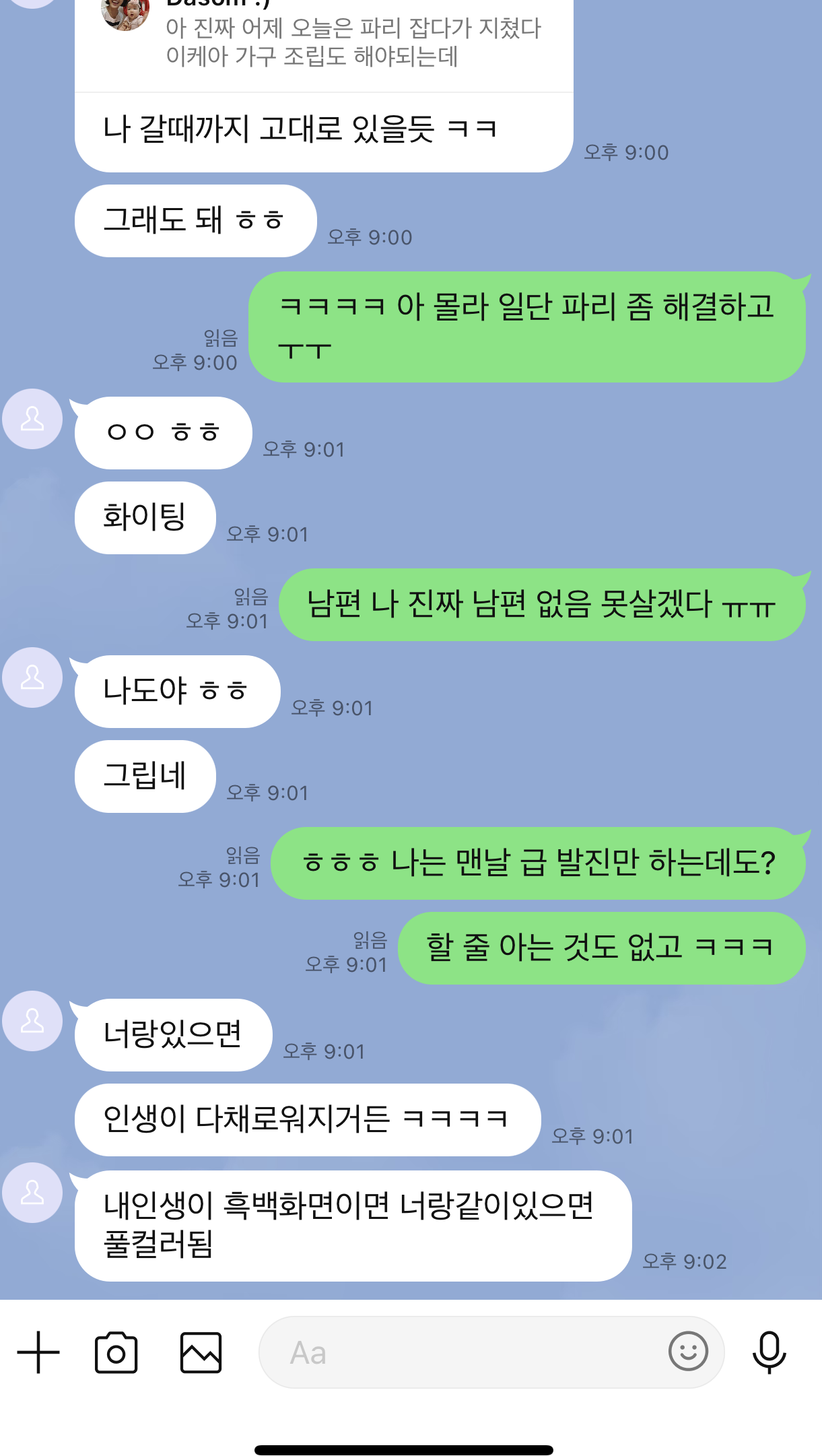 남편도 보고 싶다. 바퀴벌레 사체들을 봤을 때도 바닥을 닦아도 닦아도 더러웠을 때도 똥파리가 창궐했을 때도 남편이 보고 싶었다. ㅋㅋ (내가 이렇게 의존적인 여성이었다니 ㅋㅋ)