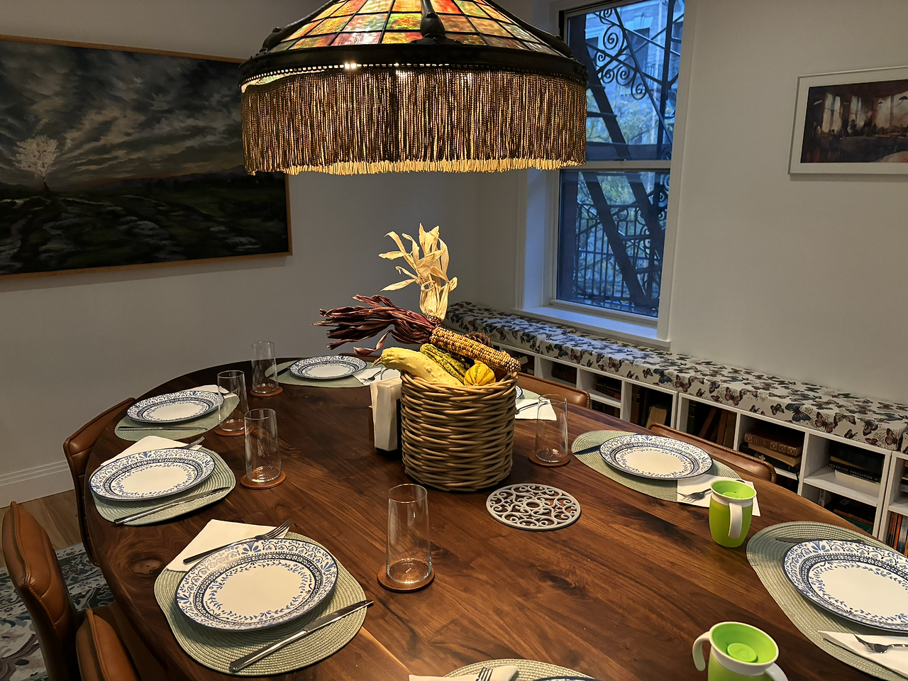 1시간쯤 돌고 사탕을 한 아름 안고 딸내미 친구 집으로 들어갔다. 그 집 아빠가 중간에 미리 들어가서 요리를 하고 있었다. 메뉴는 미트로프와 매쉬드 포테이토와 구운 그린빈스. 완전 미국식 요리였다. 테이블 가운데에는 말린 옥수수와 갈대 등이 장식되어 있었는데, 가을에 많이 하는 테이블 센터피스로 'Cornucopia'라고 한다고 했다.