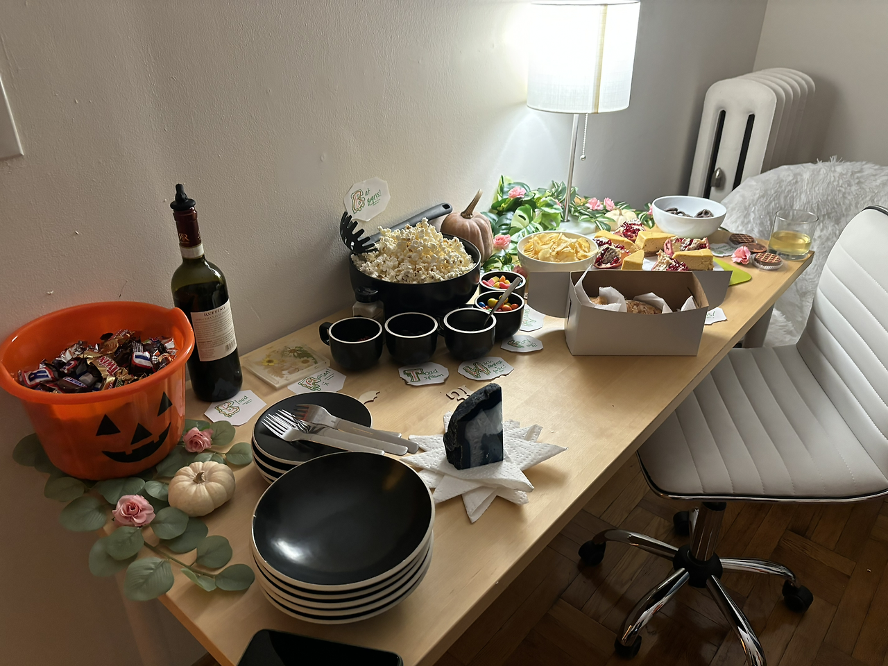 8시쯤 시작해서 영화를 같이 보는 일정이라 나는 가볍게 생각했는데, 동기들이 이것저것 잔뜩 준비해 뒀다. 스파이스드 사이다 (계피, 올스파이스 등이 들어간 따뜻한 사과 주스)/ 하드 사이다 (알코올이 들어간 주스)/ 와인에 할로윈 기념 사탕과 초콜릿에 호박 치즈 파이에 석류 등등. 엠앤엠 그릇 앞에는 '개구리 눈알'이라고 종이에 적어놓고 그 종이 주변을 불로 태우는 깜찍한 장식들도 있었다.
