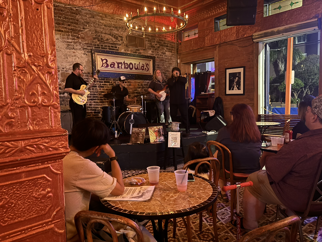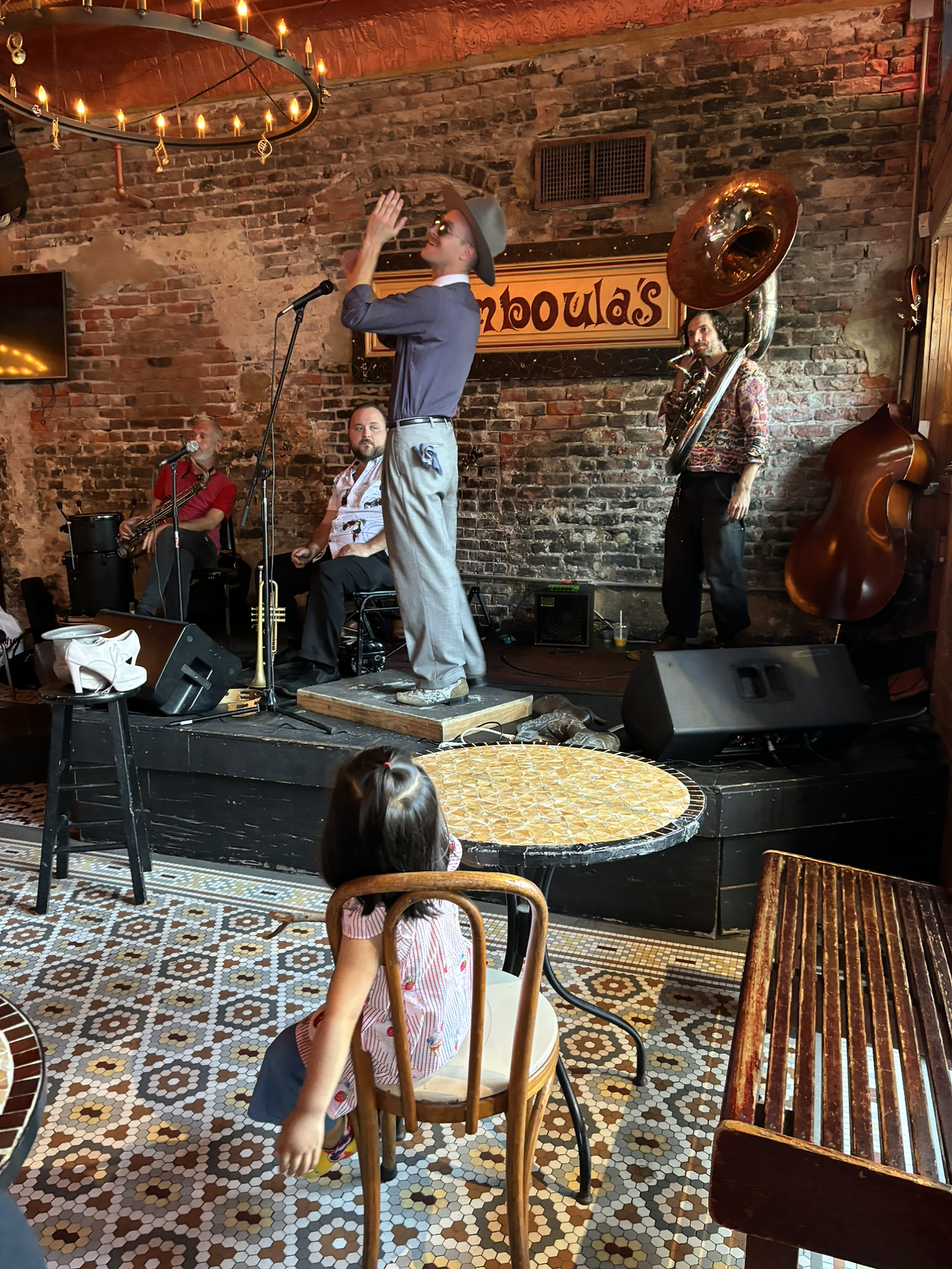 갔다 와서는 호텔에서 잠시 쉬다가 근처에 라이브 공연을 많이 하는 거리라는 프렌치먼 스트리트로 갔다. 아이가 프렌치 마켓의 컨츄리 음악 공연을 잘 보기는 했지만 딱히 기대는 안 하고, 더 늦기 전에 거리만 얼른 구경하자 싶어서 갔다. 그런데 의외로 아이가 이 공연들도 좋아했다. 저녁 5시 경임에도 불구하고 가게들은 벌써 공연을 하고 있었는데 아이는 처음 공연하는 가게에 바로 '여기 들어가자!' 하더니 들어가 자리를 잡고 앉았다. 진지한 표정으로 하염없이 듣다가 우리한테 음악에 대해 이것저것 질문하다가 장단을 맞췄다. 아이랑 같이 와서 재즈는 기대도 안 했는데, 덕분에 우리도 음악 감상을 잘했다.