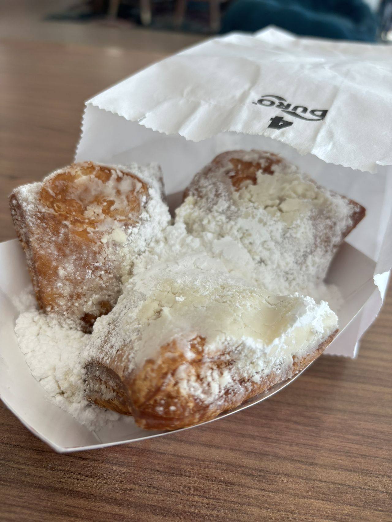 나는 잠깐 듣다가 이 기회에 뉴올리언스에서 가장 맛있는 베녯을 판다는 곳에 가서 (구글 피셜) 줄을 섰다. 베녯은 프랑스 디저트로 튀긴 도넛에 잔뜩 슈가파우더를 올린 것이었다. 도넛 + 설탕이니 맛이야 상상한 대로였지만 식감이 진짜 좋았다. 밀도가 높은데 아주 부드러웠다. 그 두 조합이 성사되기가 어려운데 정말 인상 깊었다. 나중에 베녯으로 가장 유명한 프렌치쿼터의 카페 드 몽드에도 갔는데 이 맛은 안 났다. 쓰다 보니 또 먹고 싶다.