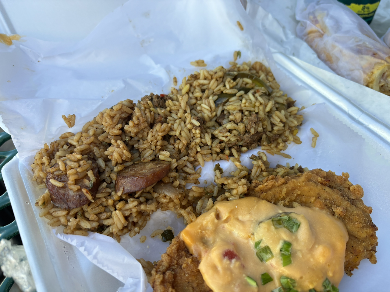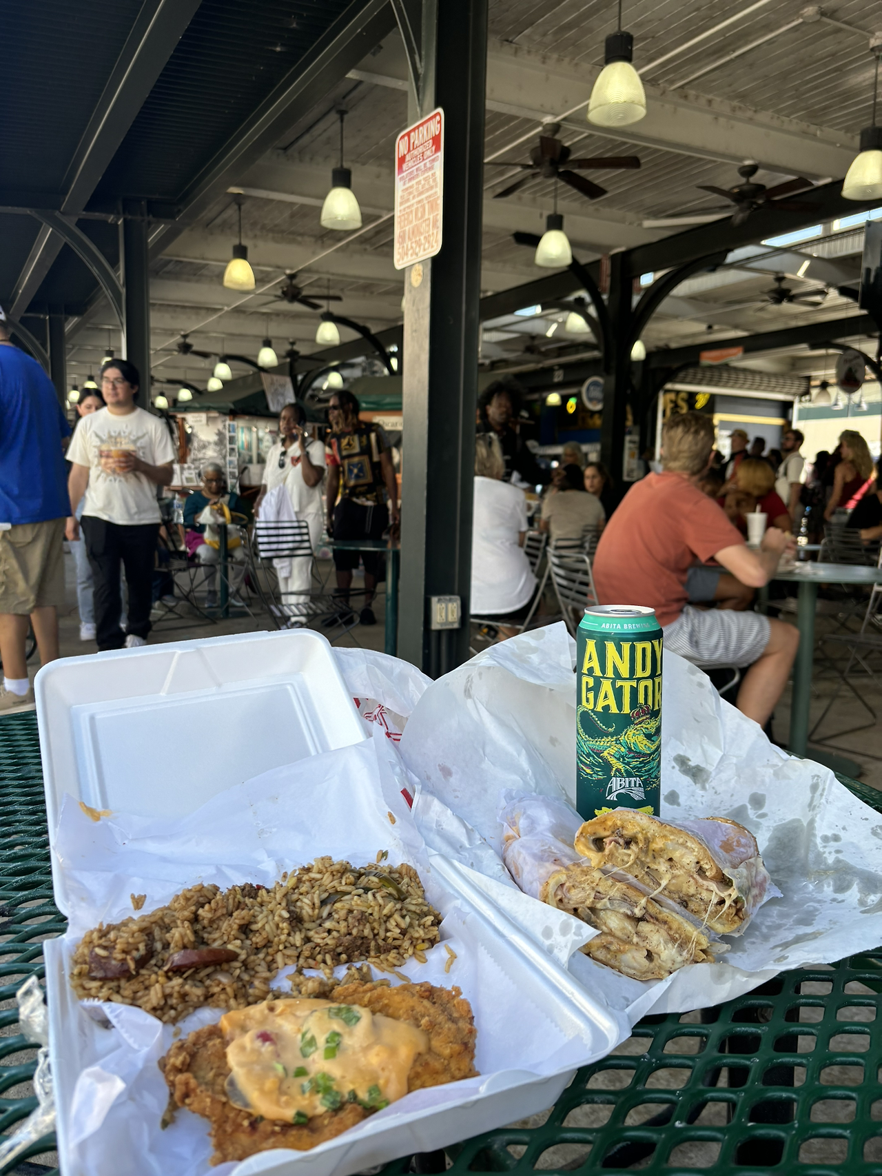 호텔에 도착하니 밥 먹을 때라서 점심부터 먹었다. 호텔 근처에 굉장히 평점이 높은 델리가 있어서 그곳에서 포보이 (육류와 튀긴 새우 혹은 생선이 함께 들어간 샌드위치)와 치킨, 잠발라야와 더티라이스를 사서 프렌치 마켓으로 향했다.