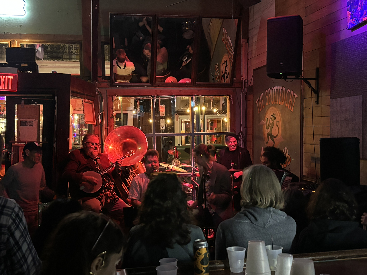 덕분에 육퇴도 일찍 맞이해서 나 홀로 재즈바도 즐길 수 있게 되었다. (남편과 하루씩 번갈아 가며 즐기기로 했다.) 밤의 프렌치먼 스트리트는 더 활기가 넘쳤다. 홍대 밤거리랑 비슷한 느낌이었다. 가장 평점이 높은 바로 들어갔는데, 음식도 팔고 테이블도 있던 아이와 갔던 가게와 달리 공연 위주의 바였다. 몇 개 바 자리 빼고는 모두 스탠딩이었고 술도 캔맥주 위주로 팔았다. 멀리서 음악을 듣다가 가까이 가서 리듬을 조금 타며 몸을 까딱거리기도 했다. ㅎㅎ 나는 음악은 잘 모르고 음악을 주의 깊게 듣는 편도 아니지만, 적어도 몸이 저절로 움직이는 음악인건 확실했다.