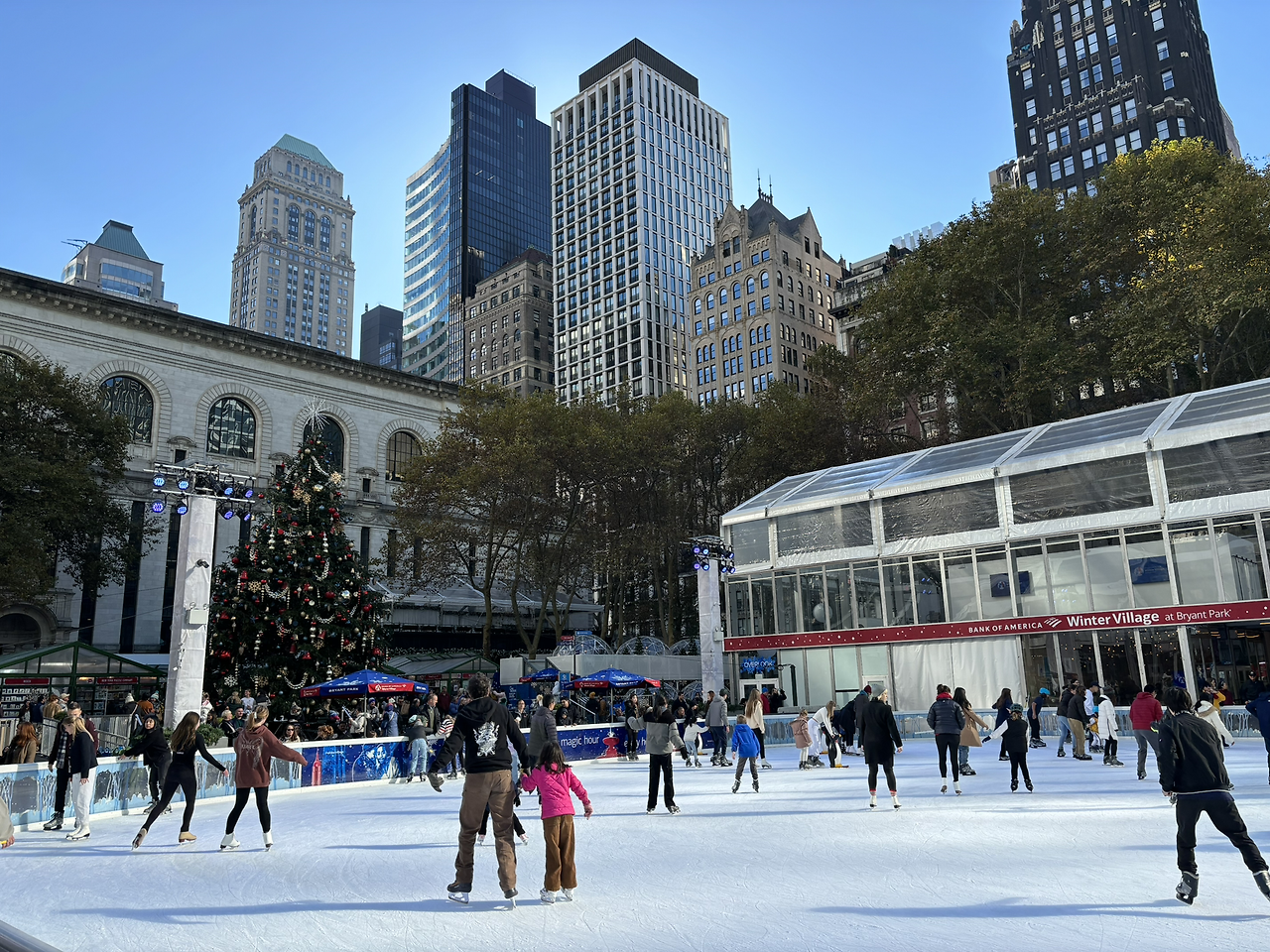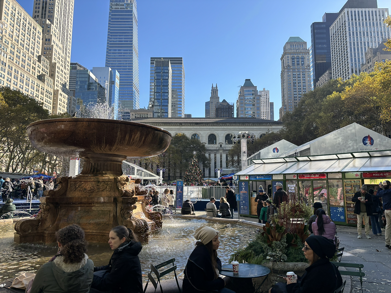 브라이언트파크는 미드타운 한가운데 있어서 이게 아니라도 워낙 사람도 많고 행사도 많이 열리는 곳이다. 그런데 겨울에는 아이스링크장, 대형 크리스마스트리, 마켓도 서서 사람이 더 미어터진다. 우리는 일요일 아침 10시 반쯤 갔는데 이미 사람이 많았다.