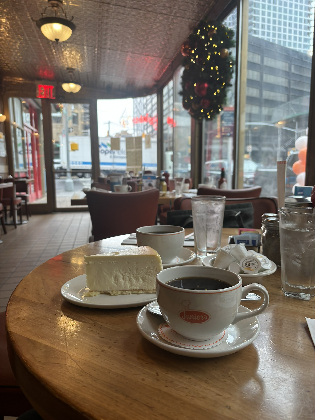 타임스퀘어에도 분점이 있어서 테이크 아웃을 해봤는데 생지도 축축하고 뭔가 실망스러웠다. 나중에 누가 사 와서 마트에서 파는 냉동 주니어스 치즈케이크를 먹어봤는데 그게 더 맛있었다. 역시 분점이라서 맛이 없었을 거라는 생각에 주니어스 본점으로 향했다 ㅎㅎ