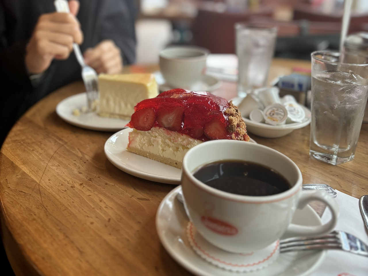 원래 레스토랑이라 치즈 케이크만 먹는 경우에는 테이크 아웃도 많이 하는 것 같았지만, 우리는 온 김에 먹고 가기로 했다. 각각 커피 한 잔씩 시키고 오리지널 치즈케이크와 딸기 치즈 파이를 같이 시켰다.