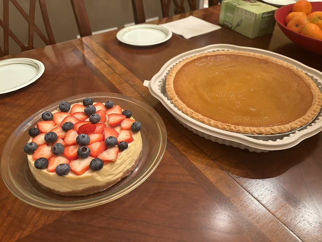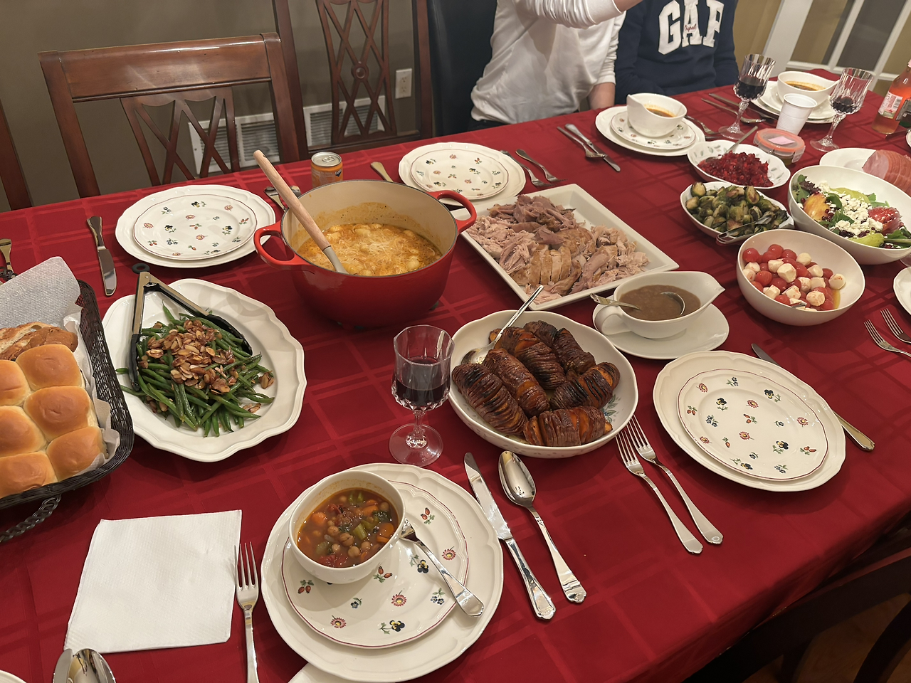 그래도 오븐에 오래 구워내고 그레이비 (육즙 소스)도 부어 먹으니 촉촉하고 좋았다. 추수감사절 저녁으로 많이 먹는 캔디드 얌도 처음 먹어보는 음식이었는데 맛있었다. 얌이라는 구황작물을 얇게 썰어 설탕과 버터와 함께 구워낸 요리였는데, 방법이 조금 다른 맛탕의 느낌이었다. 그 외에도 채소 수프, 뇨끼, 구운 그린빈, 매쉬드포테이토, 샐러드, 구운 브뤼셀 스프라우트, 마리네이드 한 방울토마토와 모차렐라 치즈 등이 있었다. 진짜 맛있고 푸짐하고 다양하게 먹었다.