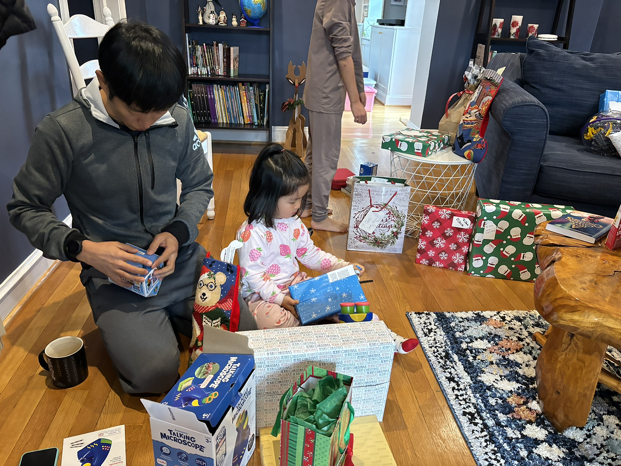 오늘은 친구 집에서 여유로운 하루를 보내고 있다. 이 집에서는 오늘이 크리스마스라서 아침부터 왁자지껄하게 선물을 열면서 시작했다. 남편과 나는 간단하게 아이당 선물 한 두 개 정도로 생각했는데 우리의 오산이었다. 일어나 보니 트리 밑에 선물이 가득했다. 산타 선물도 엄마 아빠 선물도 여러 개였다. 아이 당 선물이 최소 다섯 개는 됐다.