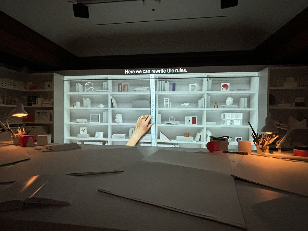 무엇보다 인상적이었던 건 전시 시작이었다. 올라가자마자 나를 작은 작업실 모형의 전시실로 이끌더니 짧은 영상을 보며 시작한단다. 영상이 계속 상영되는 형태가 아니라 내가 그 층에 올라서자마자 직원이 나를 안내해 전시실로 이끌고 내가 앉으니 전시를 시작했다. 약간 얼떨떨하게 전시를 보기 시작했다. 책상 위의 책들의 페이지가 넘어가는 걸 신기하게 바라보다 보니, 앞의 흰 벽면에 짧은 영상이 상영되더니 작가의 추구하는 바가 작가의 목소리로 소개되고 마지막엔 작가의 손이 화면을 여는 듯한 동작을 취하더니 정말 화면이 열렸다! 전시의 내용을 딱히 귀담아듣지 않았음에도 대번에 내가 무대 디자이너의 전시에 왔구나를 느낄 수 있었다.