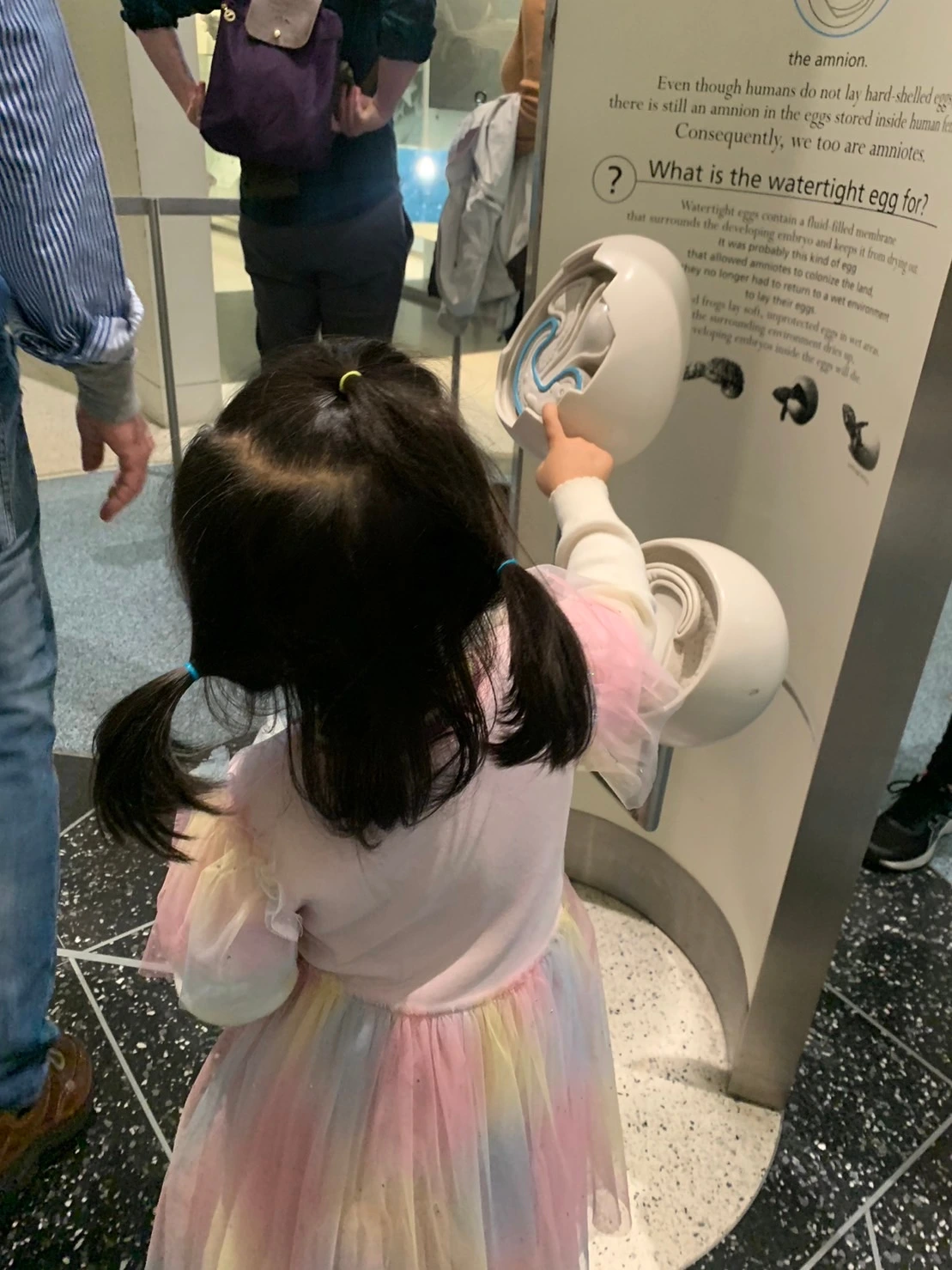 게다가 저녁에는 남편이 나에게 자기가 본 걸 설명하려 하는데 아이가 "아빠 잠깐만 있어봐 내가 설명할게" 하더니, 자신만의 언어로 아빠가 설명해 준 얘기들을 내게 전했다. 양막이 생긴 후 동물들이 알을 육지에 낳을 수 있게 되었다던지, 꽤 어려운 얘기들인데 일일이 기억하고 전해줘서 또 놀랐다.