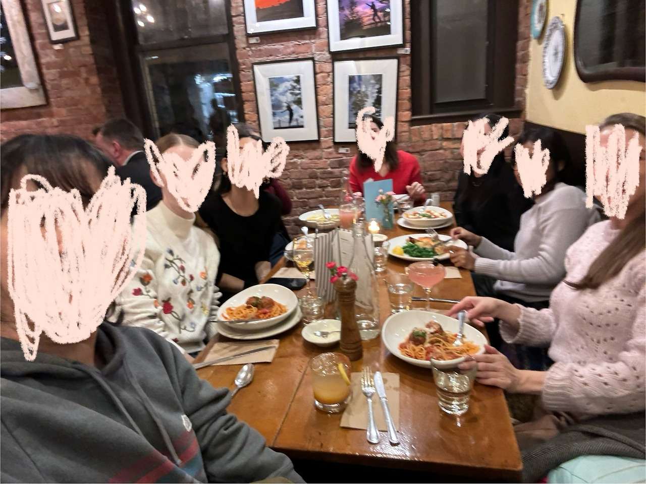 다행히 저녁이 꼽혔고, 학교 근처 치고는 평이 좋아서 가보고 싶었던 이탈리안 식당에 가게 되었다. 따로 의상 콘셉트가 있었던 건 아닌데, 갈렌타인이라고 다들 나름 빨간색이나 분홍색으로 꾸미고 왔다. 귀여운 친구들 ㅎㅎ 나는 애초에 그런 색깔 옷이 없는데, 밸런타인데이에 괜히 분홍 네일 스티커를 붙였어서 그나마 묻혀 갔다.