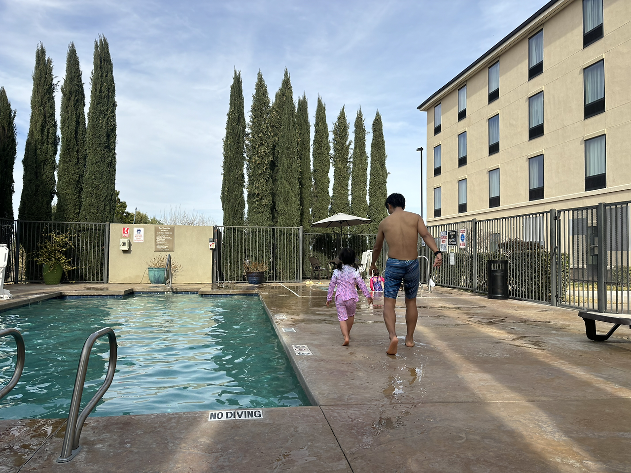 어제 3시간 40분을 운전해 와서 그런지 3시간 거리는 가깝게 느껴질 정도였다. (운전한 남편 생각은 다를지도 모른다…ㅎㅎ) 지금까지 3박은 모두 박 당 100불 (13만 원) 정도의 inn에서 숙박했는데, 오늘은 230불 (31만 원) 정도의 호텔에서 묵는다. Inn에 있을 때는 그때 대로 나쁘지 않네 싶었는데, 호텔에 오니 역시 좋다. 확실히 쾌적하고, 온탕이 있는 수영장이 있어서 오자마자 딸내미는 수영장에 들어가 나올 줄을 모른다. ㅎㅎ