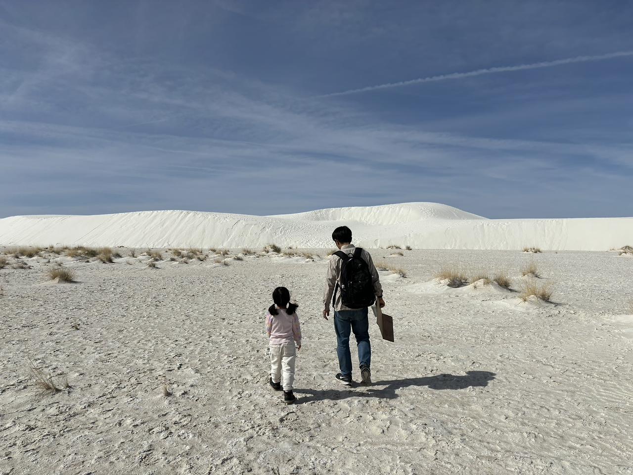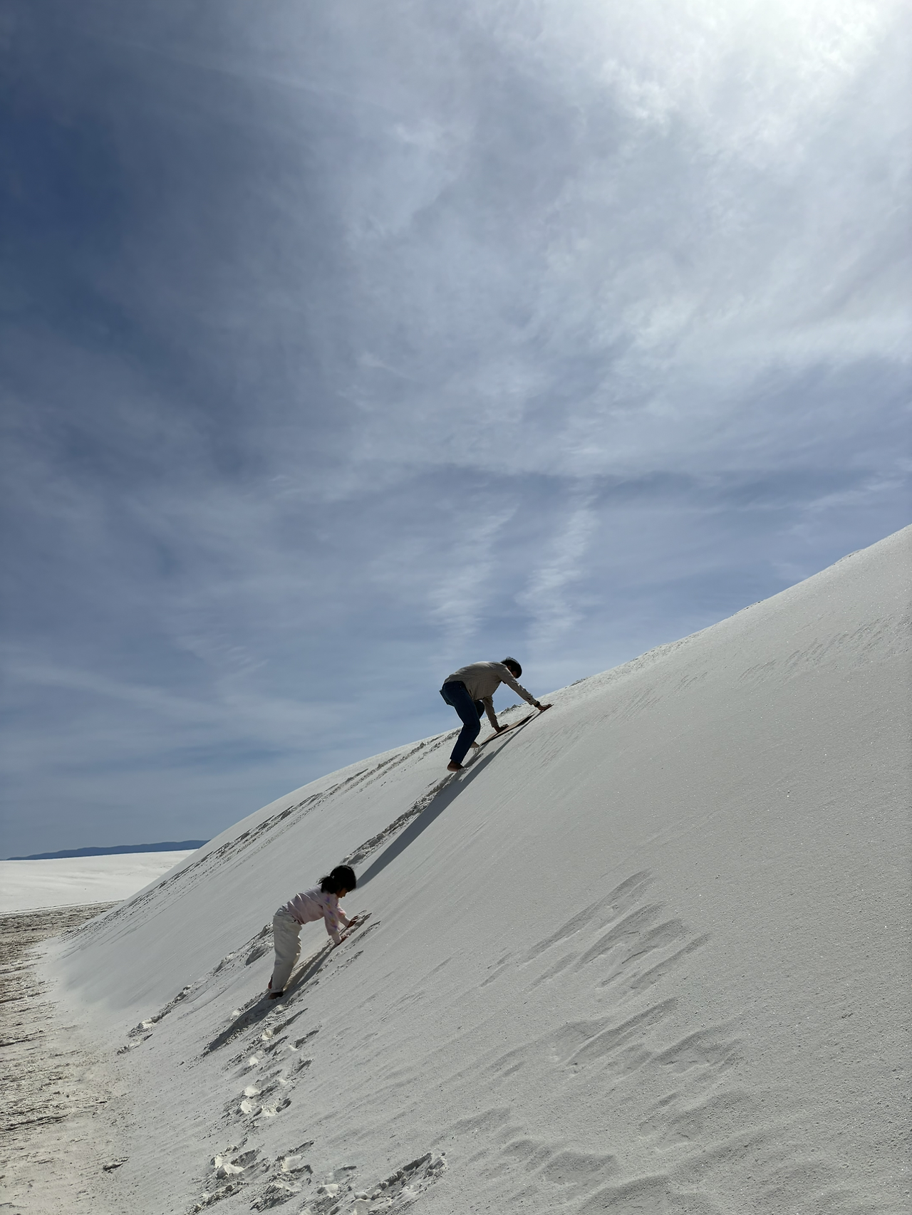 남편이 달리기를 시작하니 딸내미가 따라가고, 나도 따라갔다가 풍경이 너무 좋아 멍 때리고 있다가, 썰매도 없이 언덕 급 경사면에서 슬라이딩을 했다가, 딸의 제안으로 셋이 같이 스노우엔젤을 그리다가 했다. 딸내미 덕분에 나도 아이처럼 화이트샌즈를 즐길 수 있었다.