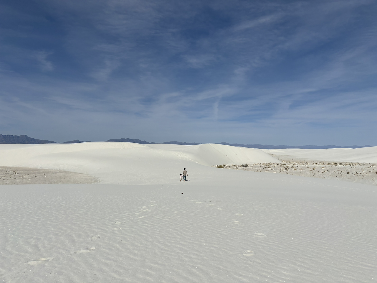 그런데 진짜 재밌었다 ㅋㅋㅋ 어제는 화이트샌즈를 탐험했다면 진짜 오늘은 제대로 물고 뜯고 즐겼다. 처음에는 어제처럼 주차장 주변 언덕에서 모래놀이로 시작했다. 그러다 점차 탐험을 시작했고, 둔덕을 4개쯤 넘고 평야를 3개쯤 넘어 까지 갔다. 지금은 성수기라 그런지 주차장 주변 언덕은 모두 발자국이 가득하고 사람들이 바글바글한데, 그 정도 가니 발자국도 없었고 우리가 언덕 일대를 차지할 수 있었다.