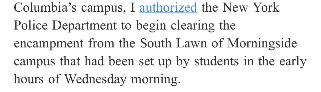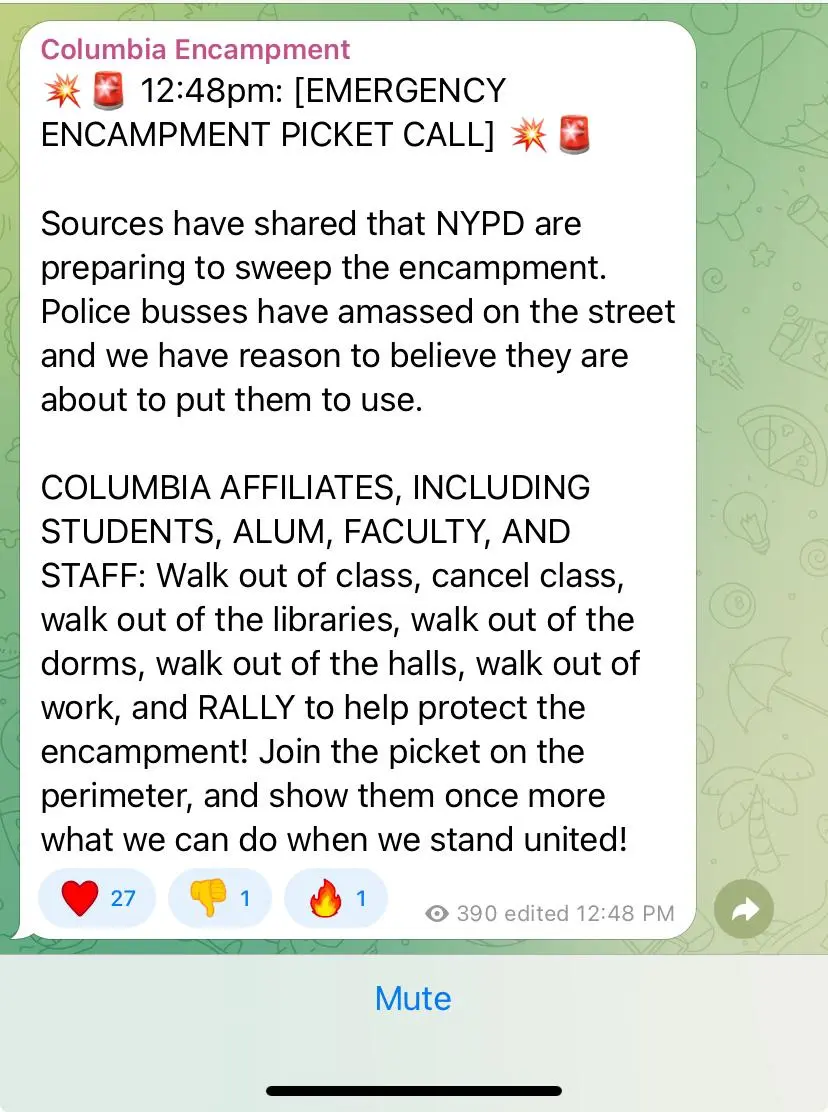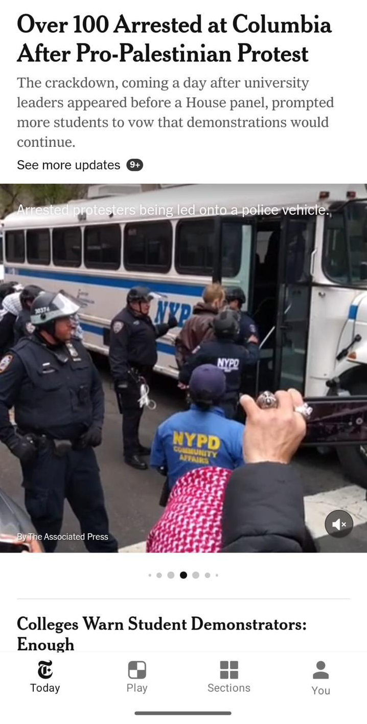 학교 정문의 7 street 아래까지 경찰 버스가 늘어서 있다며 사진이 올라오더니, 드론들이 날아다니고 있으니 참여하는 학생들은 마스크를 쓰고 핸드폰을 끄라는 조언도 올라왔다. 설마 2024년 미국 뉴욕 한가운데에서 딱히 폭력적인 시위도 일어나지 않은 대학 교정에 진짜 경찰들이 들어올까 싶었는데, 문자를 볼수록 점점 기분이 이상해졌다.