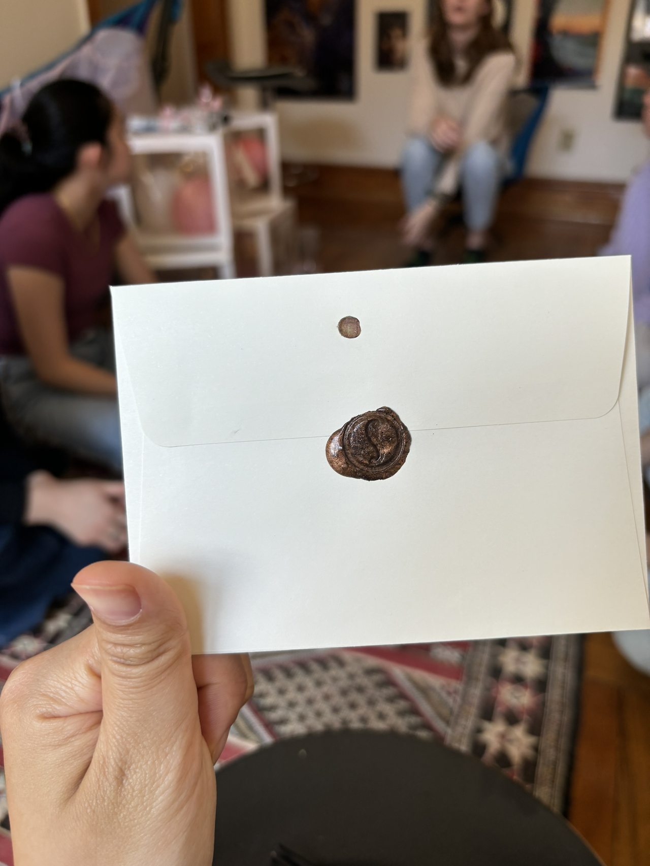 다른 친구들도 다 간단한 다과나 과일, 음료를 준비해 왔다. 나는 가져간 것도 없는데 먹을 게 한 상 차려졌다. 먹으며 수다나 떨 생각이었는데, 누군가 ‘아이가 태어나는 날짜 맞추기 게임’을 하자고 해서 각자의 예상을 카드에 쓰고 그 카드를 밀랍으로 봉인하는 깜찍한 행사도 하고, 또 다른 아이들이 가져온 폴라로이드 사진기와 전문가용 사진기로 사진도 실컷 찍었다.