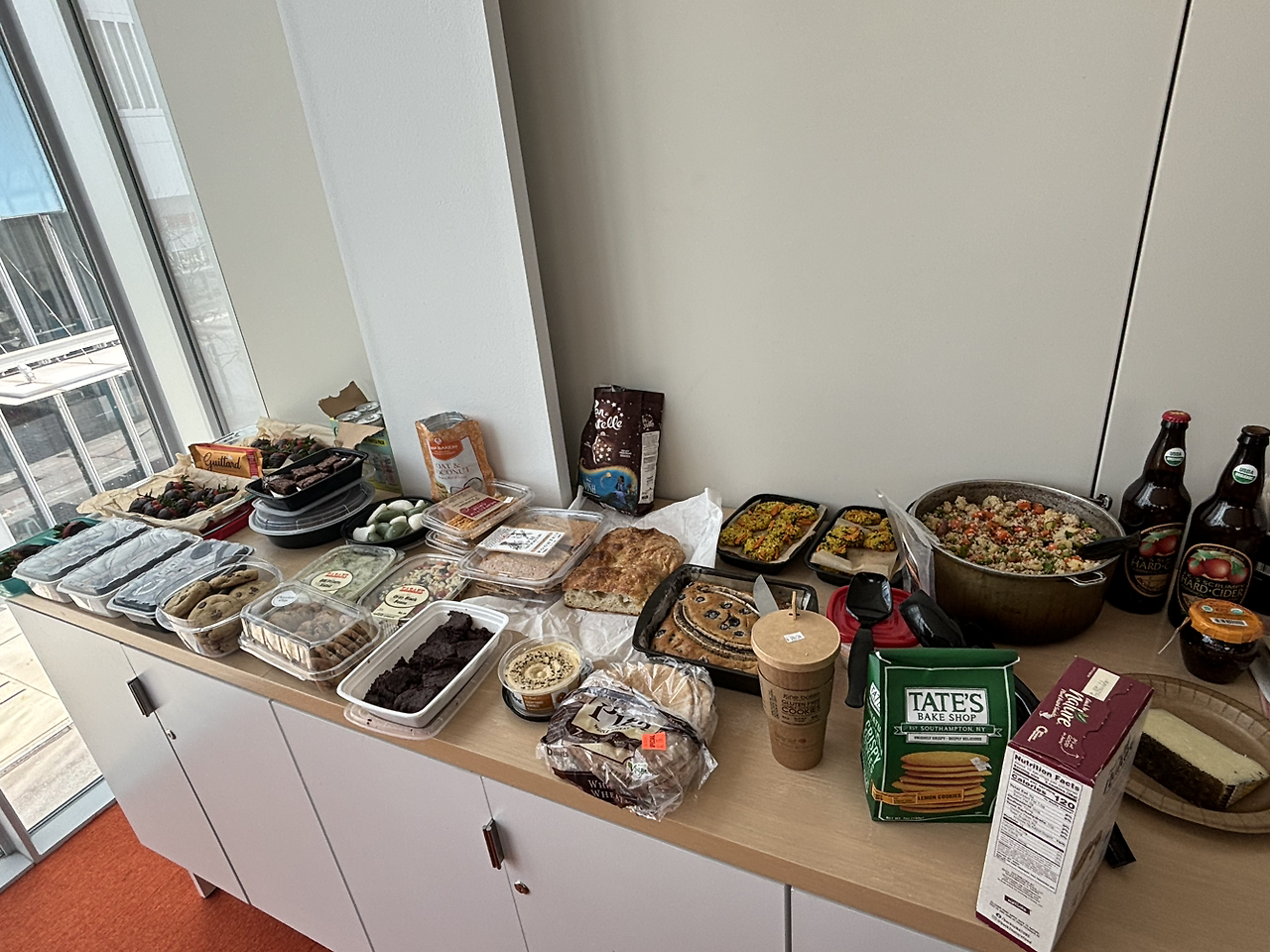 하지만 딱 그 중간이었다. 우선 밀렛 (수수) 연구에 매진하고 계신 교수님이 본인의 할머니께 물려받은 멋진 냄비에 수수 샐러드를 한 가득 해왔고, 한학기 내내 수수 얘기를 들은 홍콩 동기가 수수로 팬케이크를 구워왔다. 카자흐스탄 학생은 봄방학 때 가지고 왔다는 말고기 육포와 말고기 치즈를 내놓았고, 직접 베이킹을 해 온 사람들도 많았다. 워낙 초가공 식품의 안 좋은 점에 대해 배운 수업이라, 마트에서 사오더라도 마트에서 만들어 파는 샐러드나 치즈로만 만든 칩을 사오는 등 초가공 식품을 피해가려는 노력이 보였다. 나도 냉동 바람떡이지만 쌀과 쑥가루, 팥 앙금만 들어간 떡이었고 ㅎㅎ 오가닉 하드 사이다 (알코올이 함유된 과실 주스)나 알코올이 들어간 티를 가져온 사람들도 있었는데 그건 맛보지 못해서 아쉬웠다…