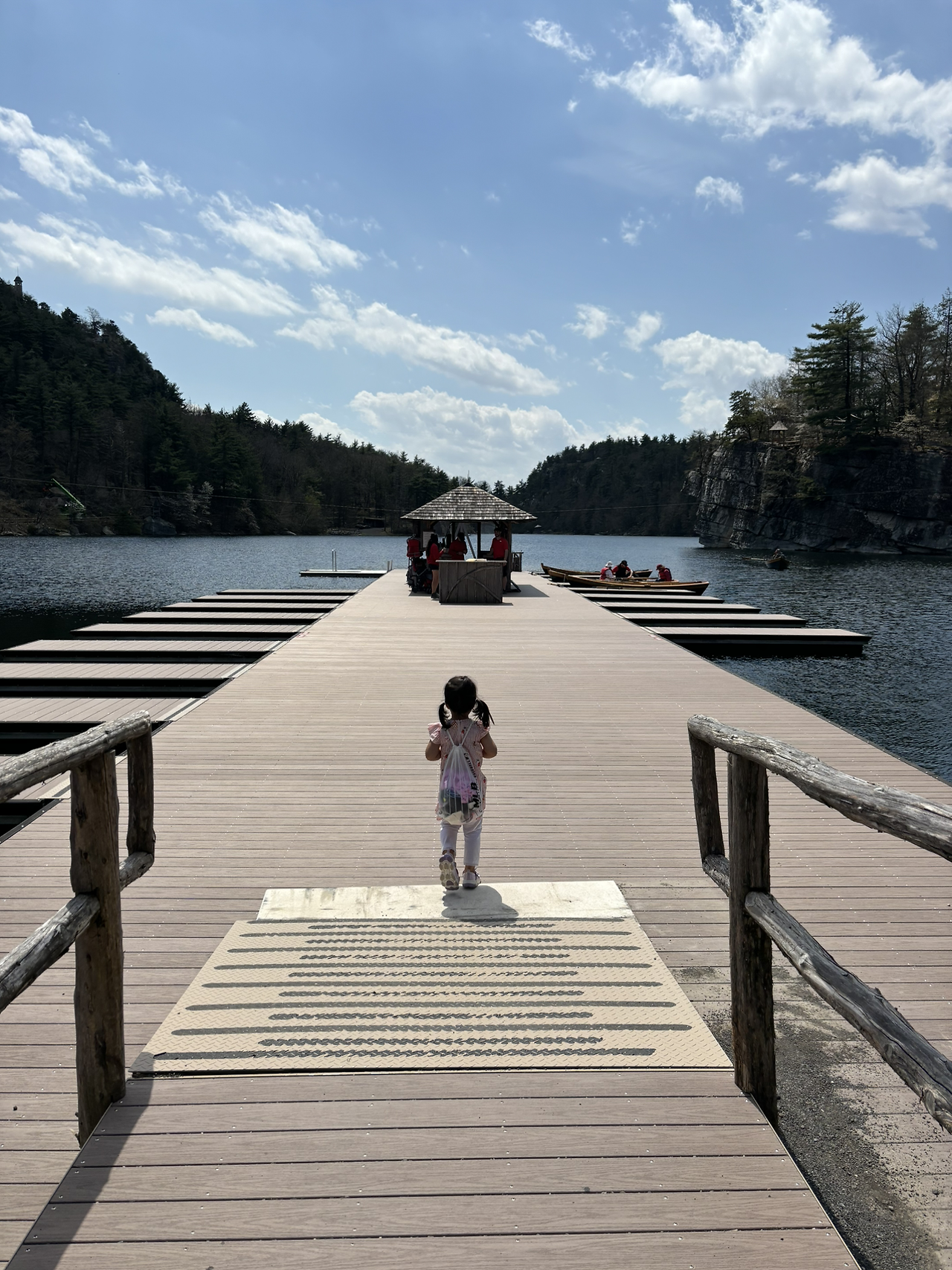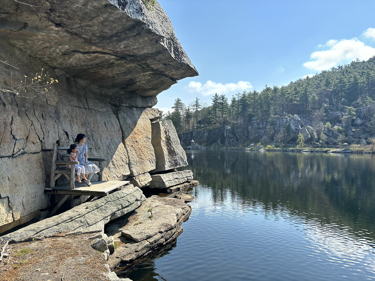 밥 먹고는 다시 바쁘게 놀았다. 호숫가의 인공 모래사장에서 한참 놀았다. 모래 놀이도 하고 거대한 바위를 파내고 만든 벤치에서 호수 풍경도 구경하다가 둥둥 떠다니는 뗏목에서도 뒹굴거렸다. (한 여름에는 호수 수영도 할 수 있는 것 같았다.) 놀게 많아서 그런지 이 쪽까지 오는 사람이 거의 없어서 우리가 거의 전세를 냈다.