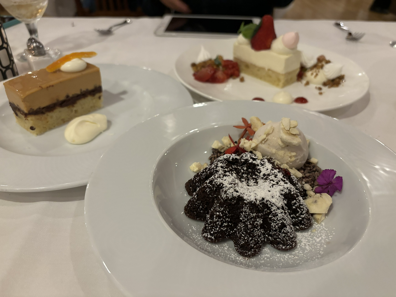 메인으로는 소고기 로스트와 돼지고기 프렌치랙, 해산물 까르보나라를, 디저트로는 딸기 크림 케이크, 초콜릿 케이크와 캐러멜 케이크를 먹었다. 엄청 잘 먹는 남편이 있어서 거의 다 먹었지만 양도 진짜 푸짐하고 좋았다.