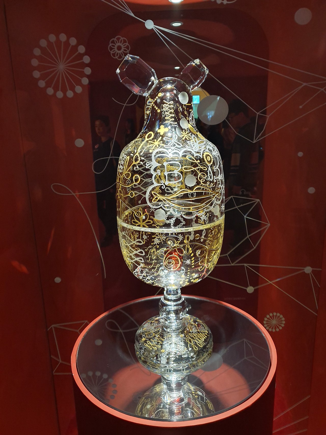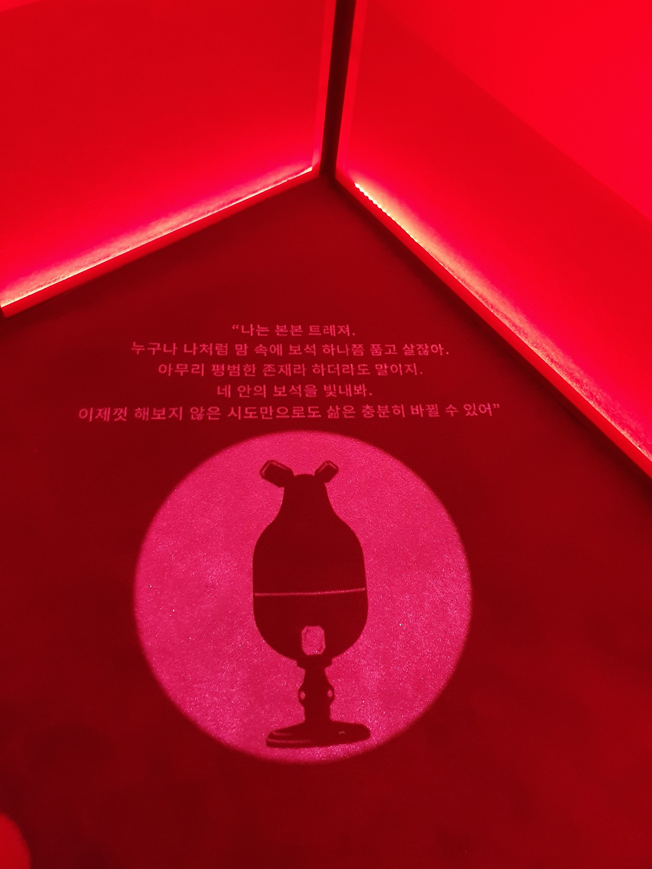 모든 작품이 인상 깊었던 건 아니다. 많은 오브제는 이해하기 어려웠다. 예를 들어 아래 사진의 오브제, 본본 트레져는 크리스털을 정교하게 가공한 오브제 안에 빨간 크리스털을 넣은 작품이다. 그 옆에 '네 안에 숨겨진 보물을 찾아봐'라는 코멘트가 달려 있었는데 나로서는 잘 와 닿지 않았다.