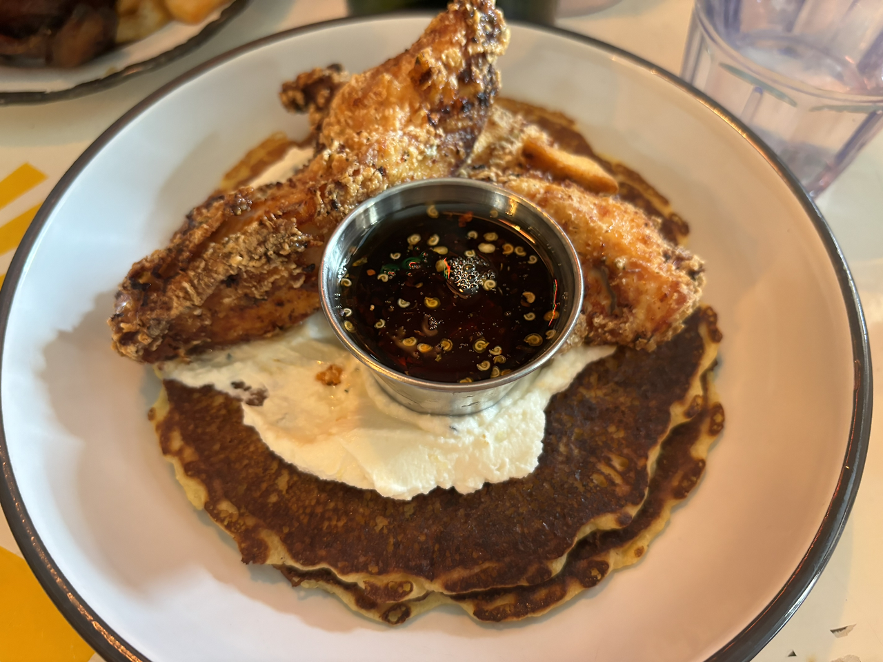 디카페인 커피 한잔과 치킨 +. 콘 팬케이크 + 리코타 치즈/ 매콤한 메이플 시럽이 나오는 음식을 시켰다. 이젠 미국 사람이 다 되었는지 아침부터도 치킨이 잘 들어갔다. 가게가 여유 있어서 크게 기대하지 않았는데, 치킨이 닭가슴살인데도 촉촉했고 음식의 전체적인 조합도 괜찮았다.