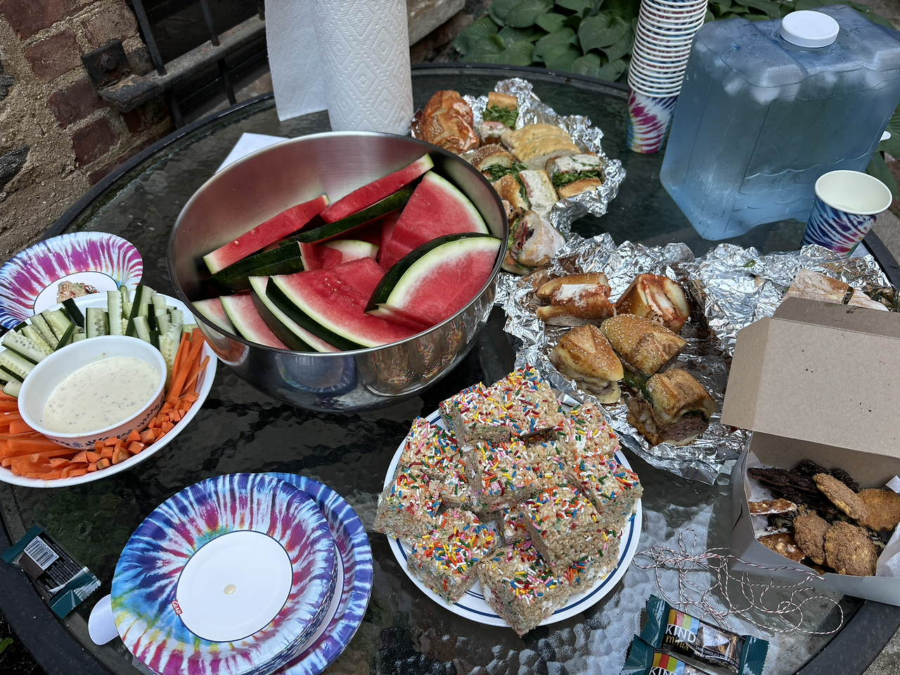 파티오 한쪽에는 음식들과 의자를 가져다 놓고, 한쪽에는 물을 틀어놨다. 딸내미 같은 반의 다른 친구 파이퍼네도 오고, 이미 낯이 익은 시드니네 이웃 벨라네도 왔다. 애들은 물 있는 쪽과 지하실을 오가며 놀고, 어른들은 시드니네가 준비해 놓은 샌드위치, 과일, 디저트를 먹으며 놀았다. 딸내미는 노느라 어지간하면 우리 근처에도 오지 않았다. 이렇게 좋을 수가 ㅎㅎ