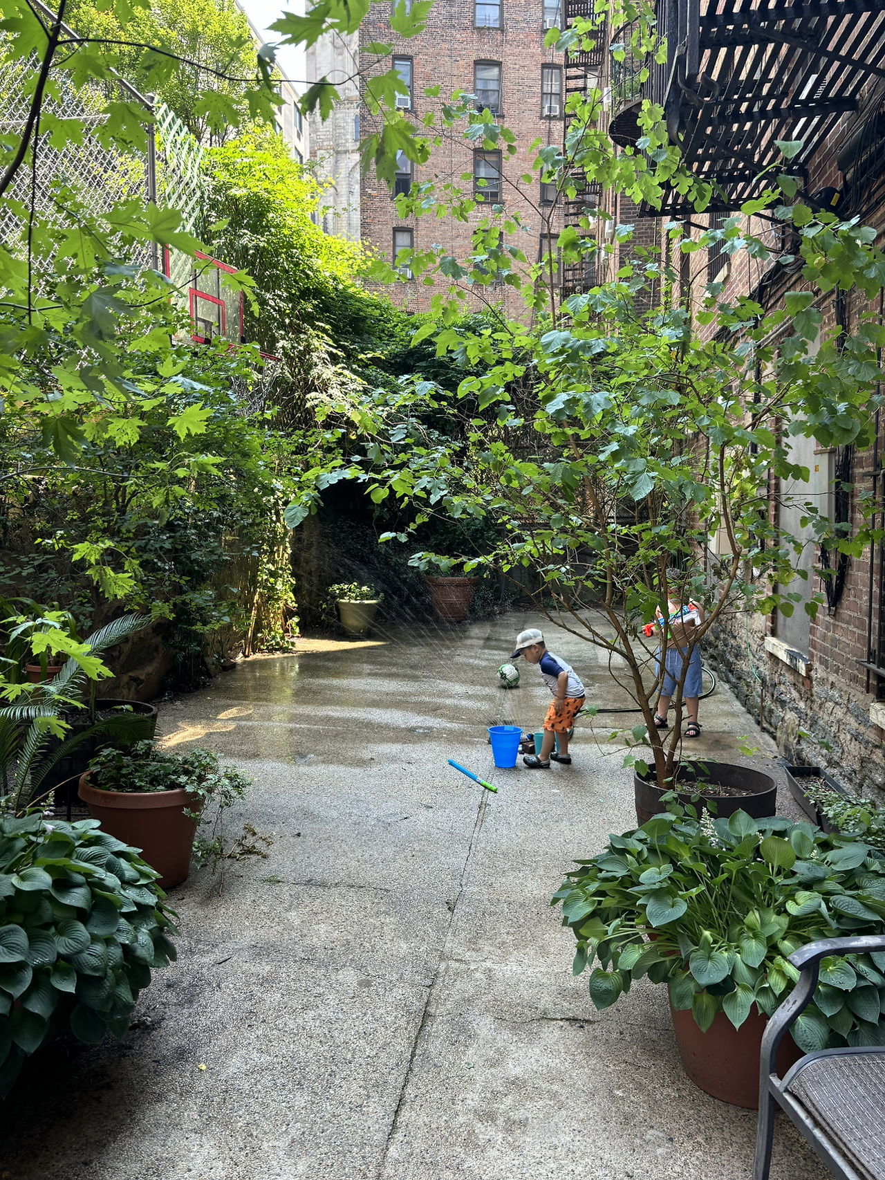 우리 건물에도 비슷한 공간이 있는데, 그냥 시멘트 마감만 되어 있고 남은 수리 자재 같은 걸 던져놨다. 주민들은 아예 접근도 안된다. 나중에 온 파이퍼네와 얘기하다 보니, 그 건물도 마찬가지란다. 그 건물은 다들 집주인들이 사는 데도 이 공간을 못 쓰게 한다고 했다. 그 공간을 관리하려면 관리비가 오른다고. 시드니네는 엄마 아빠가 둘 다 명문대 출신의 전문직이고, 조부모들도 모두 여유가 있는 중상류층인데 그래서 건물도 관리가 잘 되는 곳을 골랐나 보다.