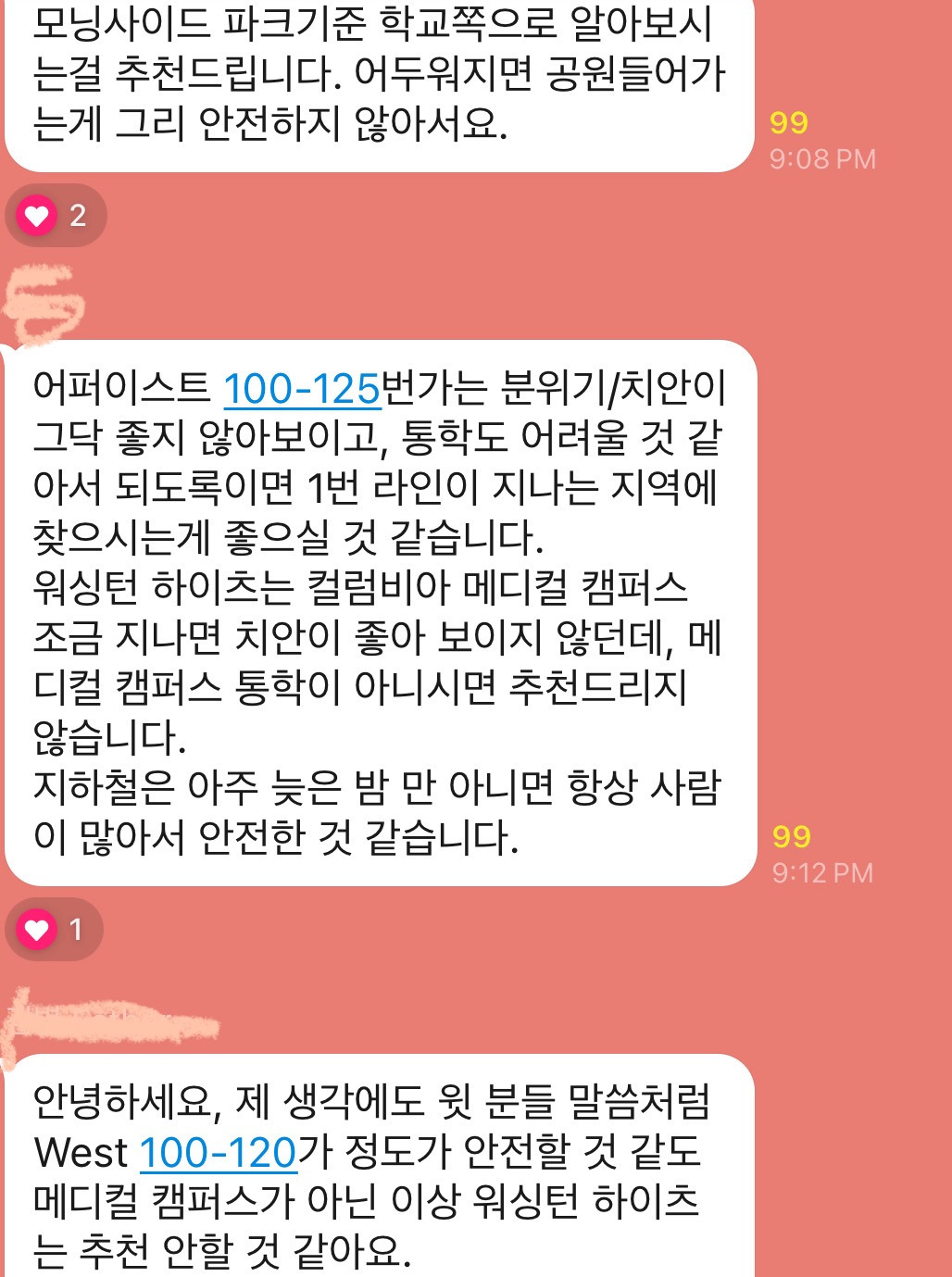 가보길 천만다행이었던 게, 동네가 진짜 험한 느낌이었다. 아침 10시에도 부랑자들이 많았고 우리에게 ‘니하오’라고 괜히 말을 거는 사람도 있었다. (미국에서 이건 약간 인종차별적 발언이다.) 거리에 백인은 아예 없었고, 아시안은 존재만으로도 엄청 튀었다. 혼자서는 어떤 시간에도 다닐 수 없을 것 같았다. 돌아와서 할렘에서 그래도 조금 안정적인 지역 렌트를 찾아봤지만 마땅찮았다. 어제 없었던 게 오늘 생길 일 없지… 병행으로 알아보던 어퍼 웨스트사이드의 최저가 물건을 일 순위로 보기로 했다.