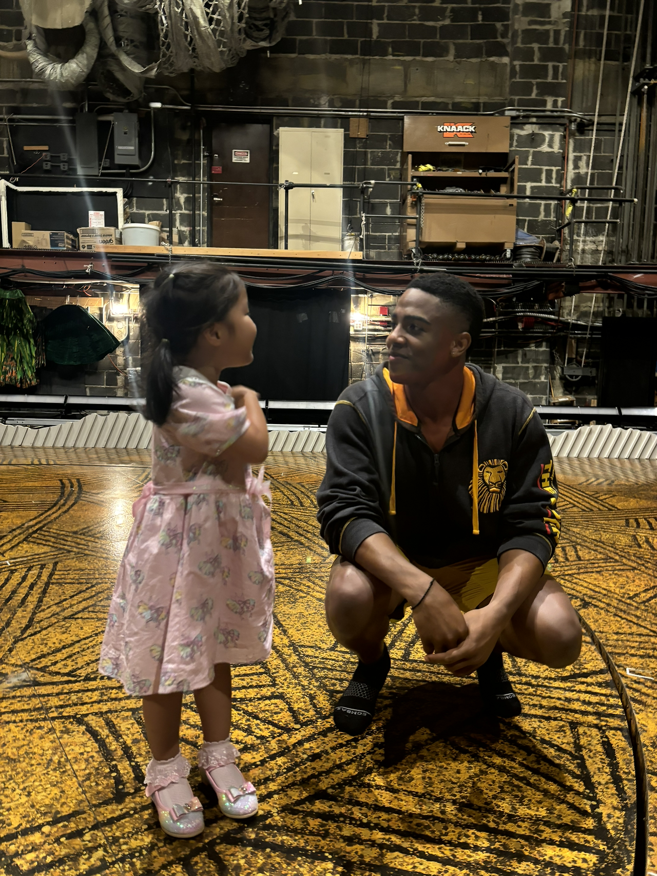 하지만 백미는 백스테이지 구경이었다. 마치자마자 스테이지 도어로 가서 카밀 아빠를 만나서 백스테이지로 들어갔다. 저녁 공연 전에 얼른 쉬려고 그러는지 대부분의 배우와 스텝들이 빠져나갔지만, 그래도 심바와 날라 (심바 여자친구) 배우를 만났다. (!) 우리가 딸내미랑 함께 있는 데다, 알고 보니 카밀 아빠가 단순 키보드 연주자가 아니라 종종 연주팀을 이끌기도 하는 부 지휘자라서 그런지 다들 굉장히 친절했다. 먼저 와서 인사를 하고 딸내미랑 대화를 나누고 사진도 찍어줬다.