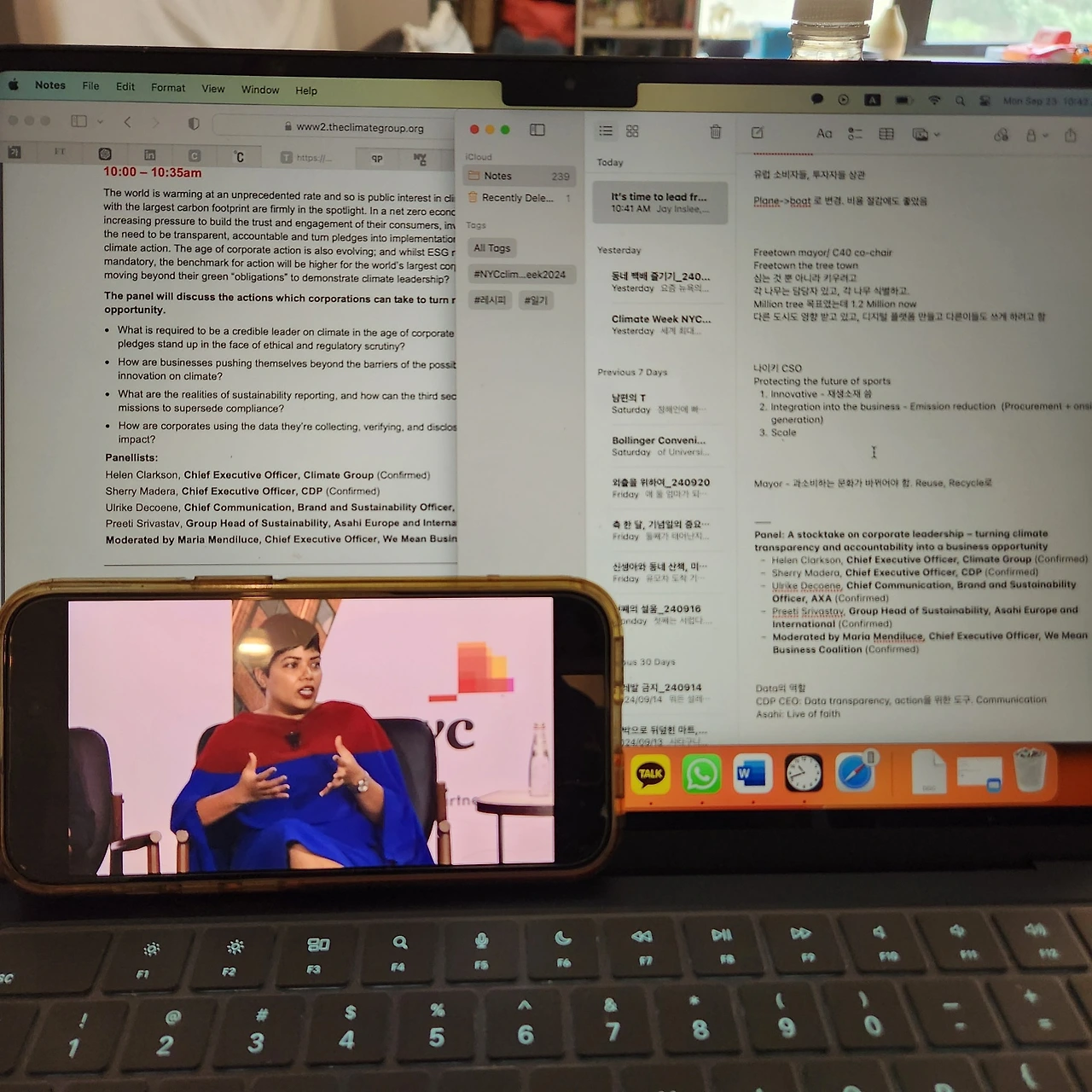 다른 연사는, ’ 2035년까지 지금 있는 기술만으로 온실가스 배출을 50% 줄일 수 있다’, ‘화석연료 산업은 과거 프레임워크, 평등하지 않은 체계로 짜여왔다’, ‘Gas는 석유보다는 깨끗한 에너지라 전환과정에는 쓸 수 있다고 하지만, 그건 10-20년 전 얘기고 이제는 Gas 사용도 중단해야 한다’ 등등 열정적으로 얘기를 했다. 내게 새로운 얘기는 아니었지만, 누군가 이런 얘기를 열정적으로 하는 것을 보니 Climate Week느낌이 났다. ㅎㅎ