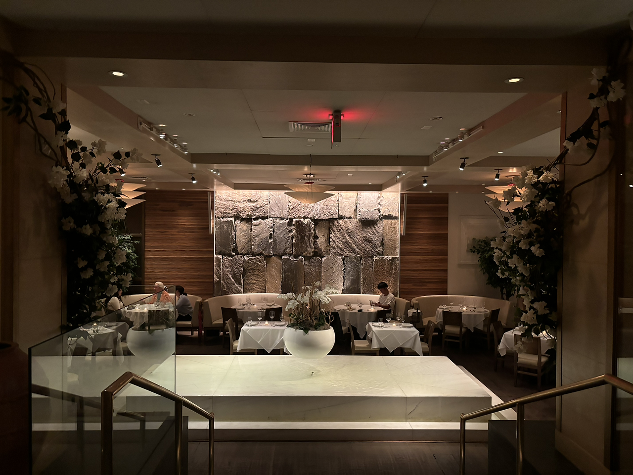 문을 열어주는 도어맨, 자리로 가며 보이는 거대한 생화 장식과 대리석, 작은 물 웅덩이 등으로 보아 메뉴판을 보지 않아도 고급 식당임을 알 수 있었다. 이름 있는 곳이라 일요일 저녁임에도 사람들이 미어터졌다.