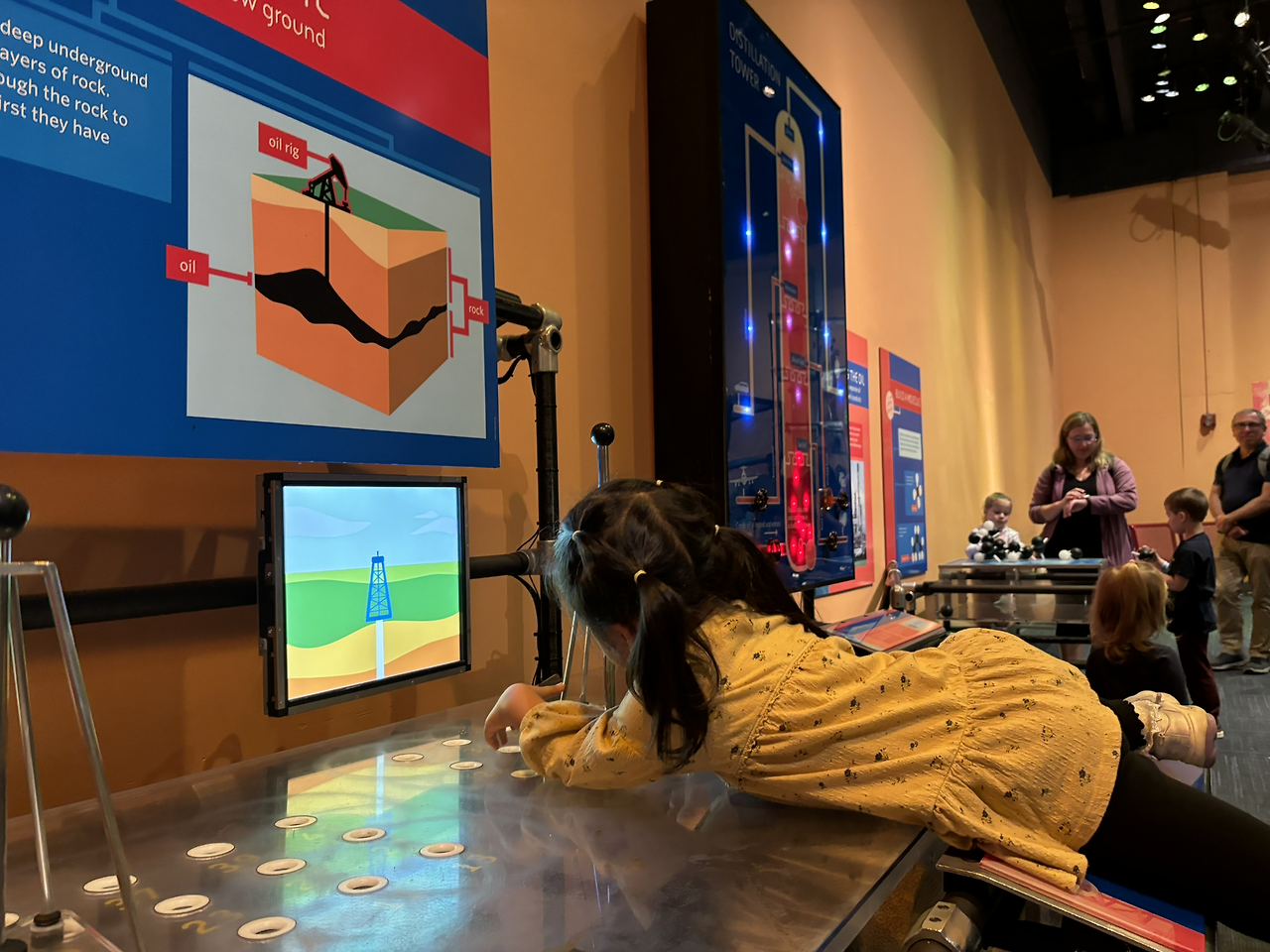 미니 동물원, 공룡 발굴 체험, 화산 폭발 체험, 에너지 생산 체험 (오일 채굴, 태양광 발전, 원자력 발전 등등) 엄청 다양한 주제로 체험할 거리들이 있었다. 미국 최대 플라네타리움 등 추가 티켓을 구매하고 가야 하는 곳들도 있었는데, 그 외 체험 만으로도 하루가 꽉 찼다. 딸내미가 제일 좋아했던 건 오일 채굴 체험이었다. 엄마는 기후 전공인데 ㅋㅋ