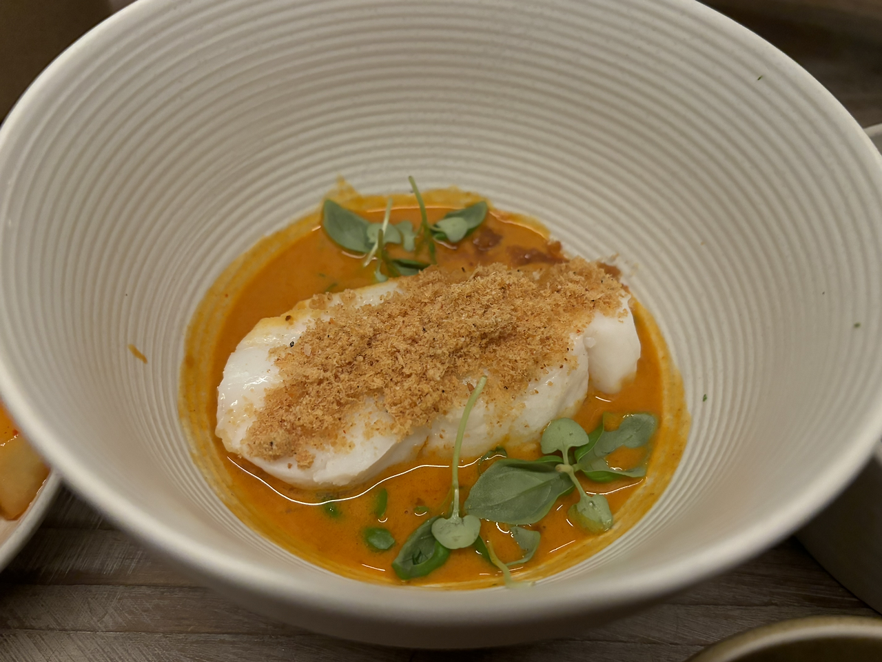 음식은 예상대로 한식이 여러 가지로 변형되어 있었다. ‘고추장’ 카레가 생선에 곁들여 나오고, 닭강정식으로 만든 스쿼시 강정 위에는 치즈 폼이 올라갔다. (치즈 닭강정이 연상됐다), 소꼬리 수육에는 고수와 치미추리 소스 (중남미 소스)가 더해졌고, 추가로 시킨 수정과 셔벗에는 부라타 치즈와 호두강정이 함께 나왔다.