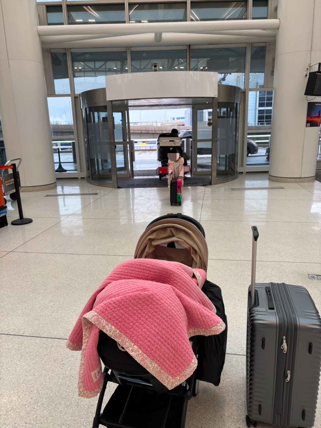 유모차에 싣고 걸고, 남편이 몇 번 왔다 갔다 해야 하긴 했지만, 첫째도 큰 도움이 됐지. 자기 백팩 하나와 캐리어 하나는 자기가 책임지기 했더니, 기가 막히게 챙겼다. 그 짐도 자기가 쌌는데. 우리가 정신없는 중간중간 둘째 말도 걸어줬다. “튼튼아 공항 왔다~ 우리 이제 한국 간다~” 하면서. ㅎㅎ 미국에 올 때까지만 해도 첫째를 챙겨야 했는데 이제는 한몫을 단단히 했다.