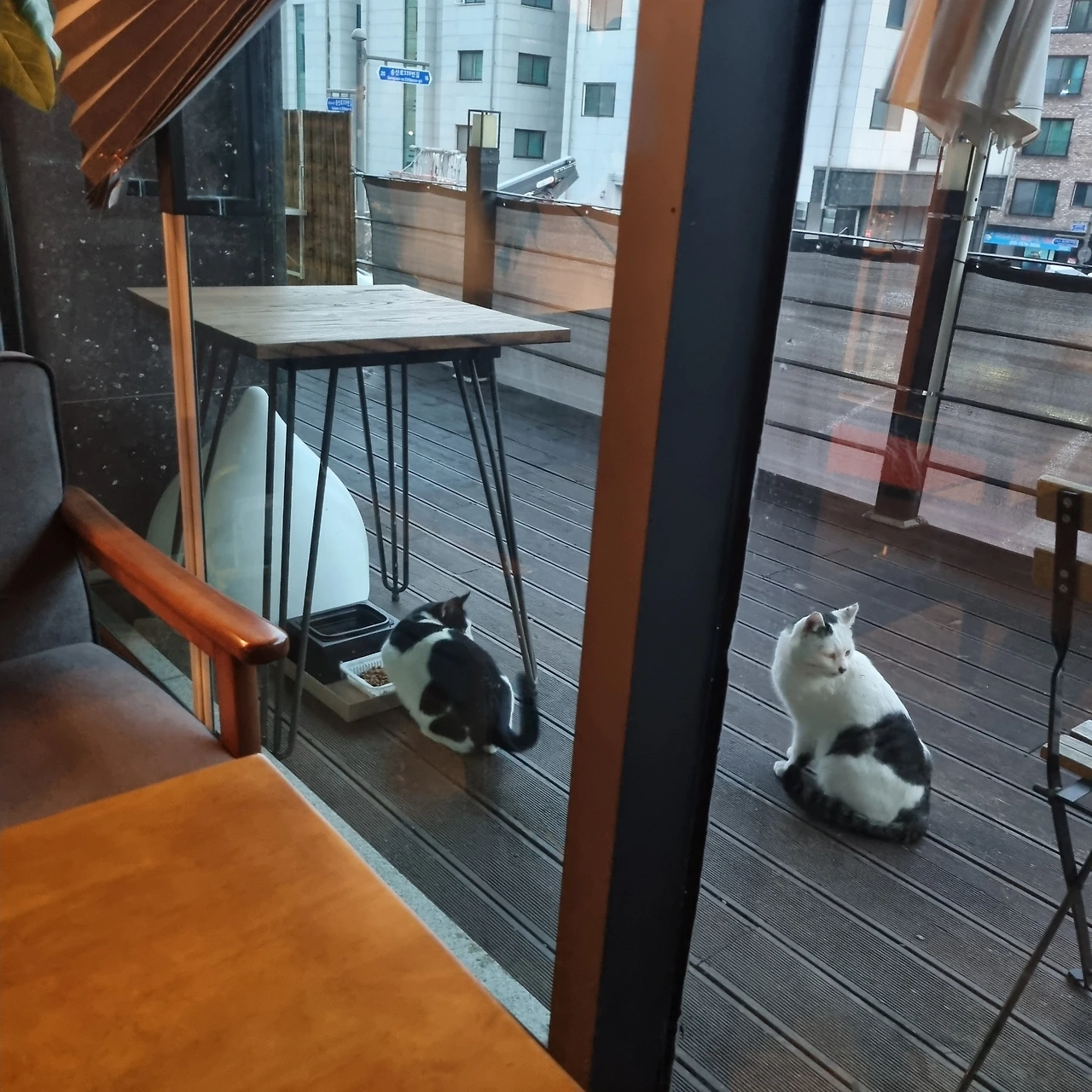 그날 이게 무슨 개고생인가 싶어 앉아 땀을 닦는데 비를 쫄딱 맞은 행색이 나만큼이나 꾀죄죄한 검은 길냥이가 지나가다가 한참이나 내게 눈을 맞추는 것이 뭔가 할 말이 있지 싶었다. 아마도 '넌 어디서 굴러먹다 온 인간이냐?' 이런 느낌이었다. 아무튼 그 꾀죄죄한 길냥이 신세가 꼭 나 같아서 눈에 들었는데 나중에 직원이랑 밥을 챙겨주기 시작한 게 아직까지 이어오고 있다. 나중에 알게 된 사실, 그 녀석은 이 동네의 왕중왕이었다. 어느 날부터 한 녀석 한 녀석 패밀리를 데려왔다. 알아서 먹여 달라는 눈치였다. 우린 한순간에 길냥이 집사가 된 셈이다. 그간 많은 길냥이가 다녀갔다 제법 사람 손도 마다하지 않는 녀석도 있었지만 길냥이는 길냥이라 자라면서 영역을 넓히더니 인적이 없을 때 조용히 다녀간다.