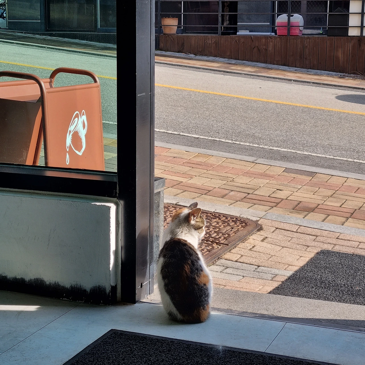 작년 겨울부터 그간의 녀석들과는 결이 다른 새끼 한 마리가 왔다. 새끼가 너무 어릴 때 어미가 독립시킨 것인데 카페 현관 앞에 앉아 하루종일 우는 거였다. 울 때마다 직원이랑 맛난 걸 챙겨주고 놀아줬다. 커피를 볶다가도 눈을 맞추고 시간이 나면 놀아줬다. 그래도 길냥이라서 손님들을 보면 엄청나게 경계를 했는데 밥 챙겨주는 사람은 잘 알아보고 경계를 풀었다. 머리도 만지게 해 주고 등도 쓰다듬게 허락을 했다. 그렇게 제법 시간이 흐르고 밥을 안 먹을 때도 만져주고 쓰다듬어 주고 긁어주면 그렇게 좋아라 했다. 안아 올려도 얌전했다. 지금은 문을 열어두면 카페 안으로 들어와 제 맘대로 꼬리를 꼿꼿이 세우고 돌아다니며 손님들과도 눈을 맞춘다.
