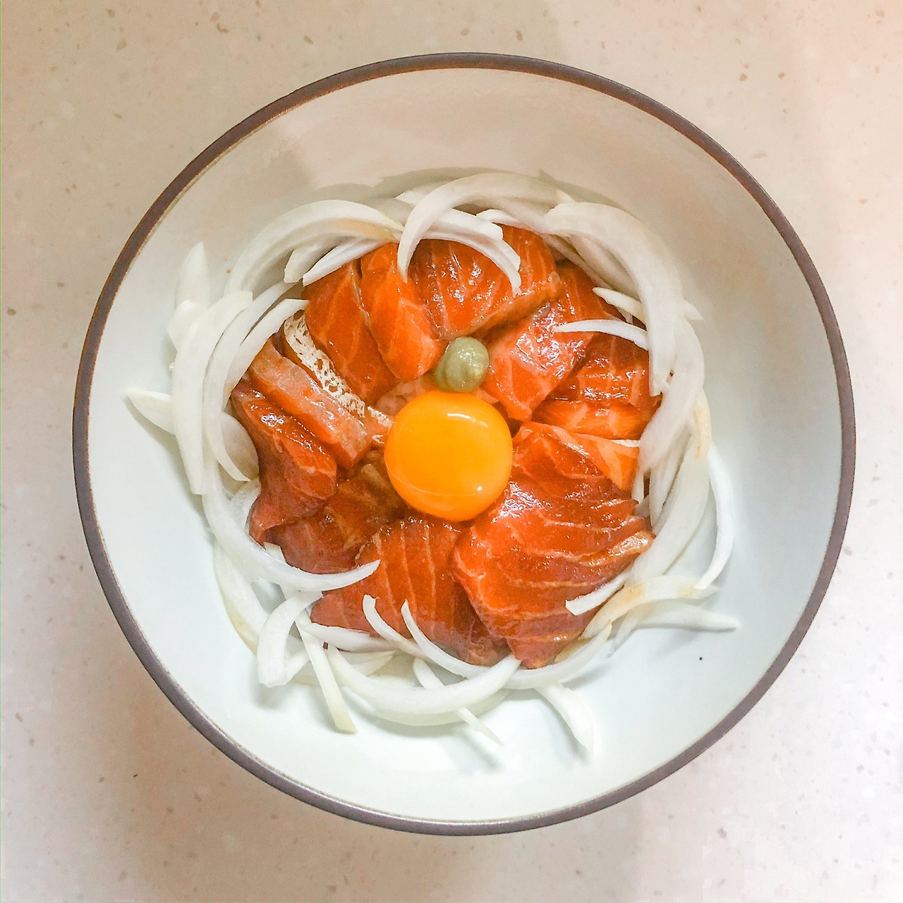 간장, 물, 설탕, 미림의 비율을 취향대로 냄비에 넣고 (나는 2:1:1:1로 했는데 조금 짰다......) 양파와 대파를 큼직하게 썰어 함께 부르르 끓인다. 약불로 10여분 정도 더 끓이고 완전히 식혀준 뒤 미리 썰어둔 연어가 잠길 때까지 간장을 넉넉히 부어준다. 냉장고에서 반나절 정도 숙성시키면 되는데 나는 좋아하는 음식 앞에서 참을성이 없어져서 4시간 만에 냉장고에서 꺼내 들었다. 밥을 따뜻하게 데우고 양파도 얇게 채 썰어 준비한다. 간장을 머금어 까무잡잡해진 연어를 밥 위에 올리고 노른자를 가운데에 조심히 얹어준다. 튜브로 된 고추냉이도 찔끔 짜주고 나니 영롱하기 그지없다.