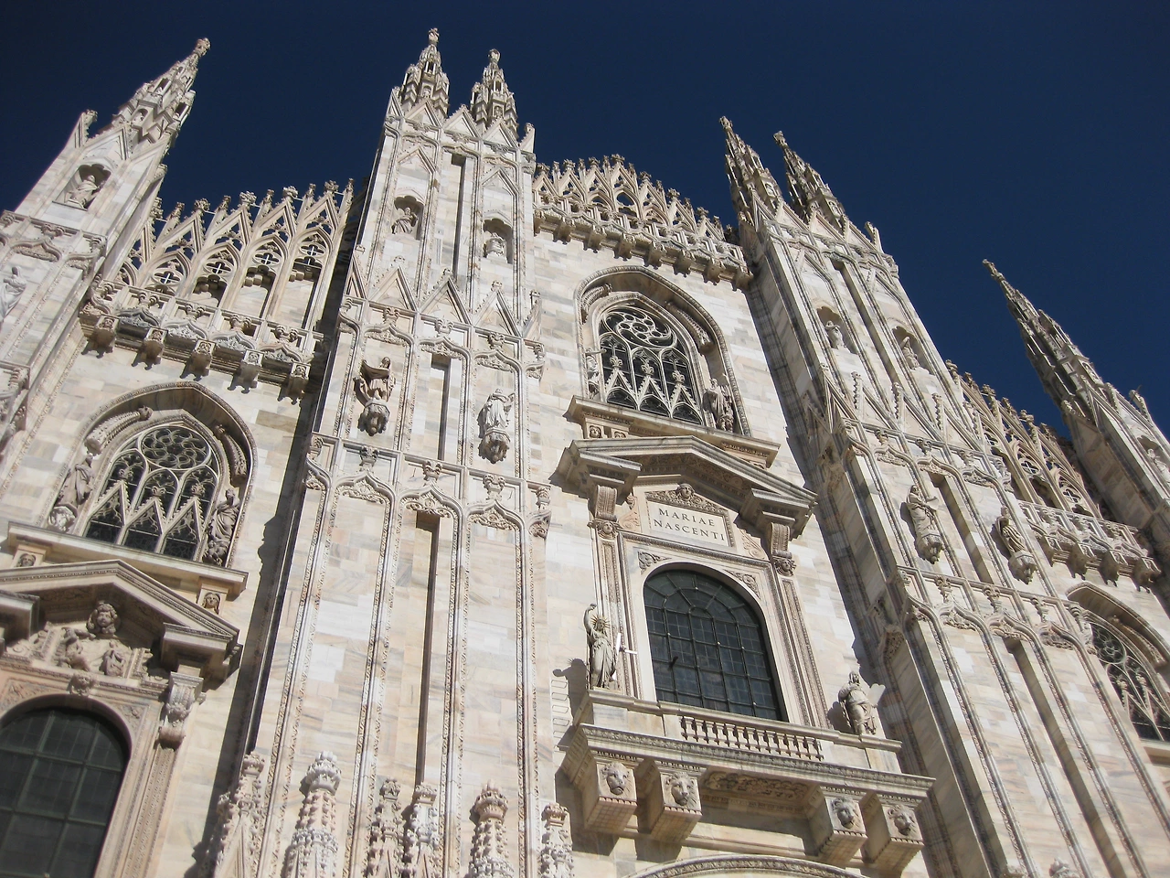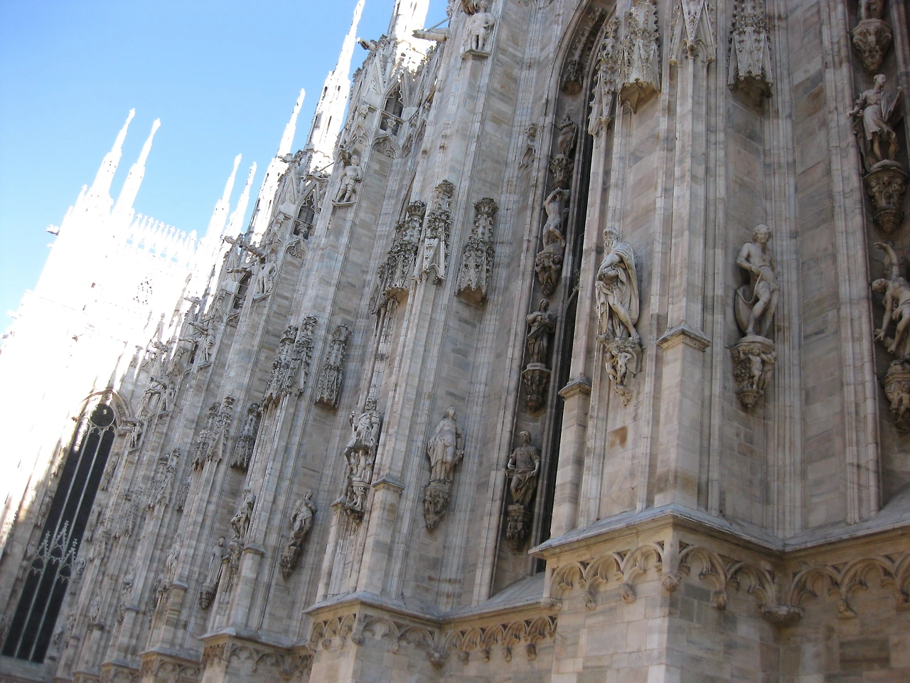 성당 전체가 흰 대리석으로 덮여있고, 기둥과 부벽 위에 인상을 이고 임립 하는 소첨탑은 자그마치 135기를 헤아린다.