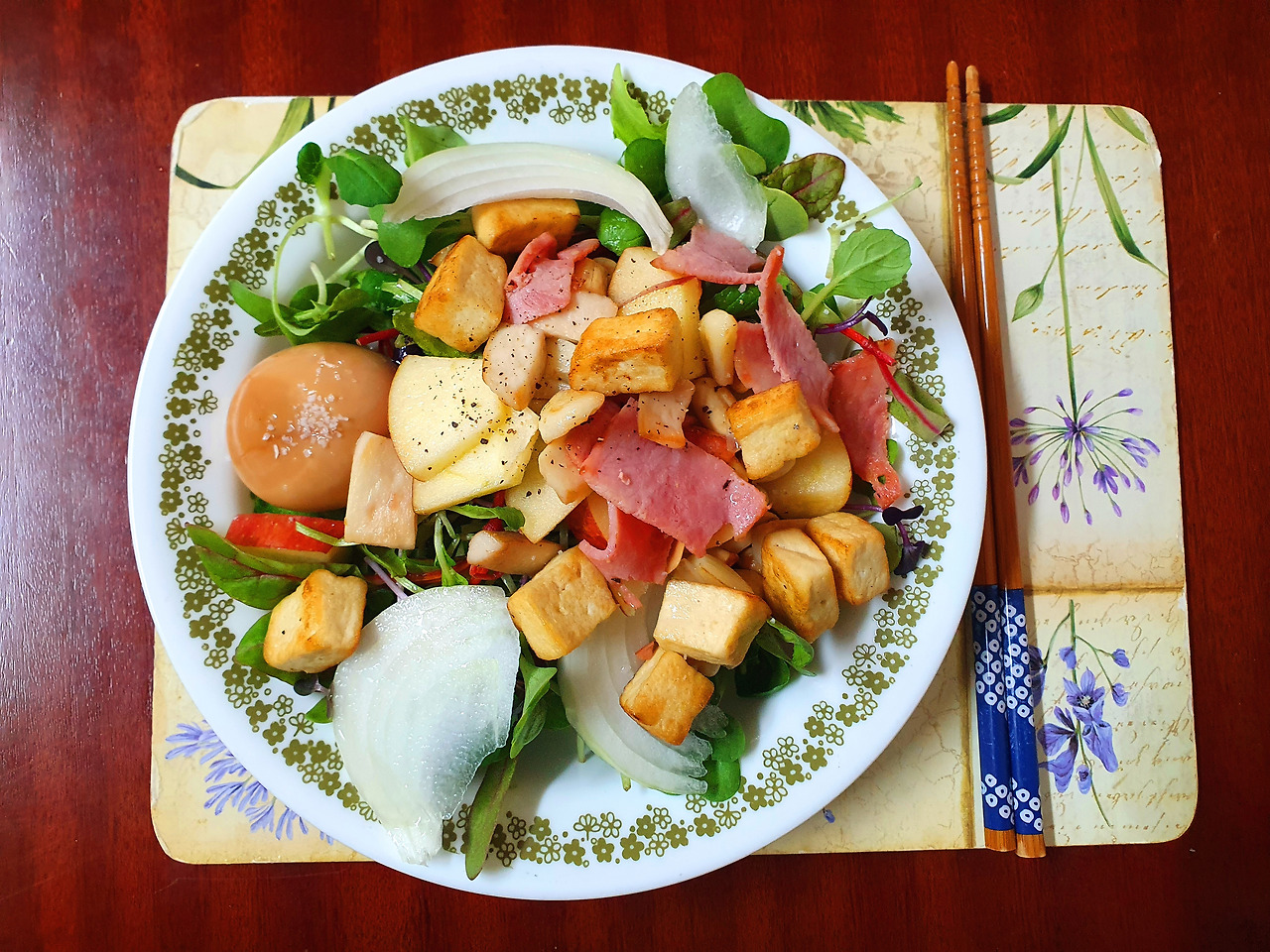 점심 한끼로 구운달걀 한개 곁들인 접시에 맨처음 녹색잎 채소를 한두 줌 적당히 올리고,