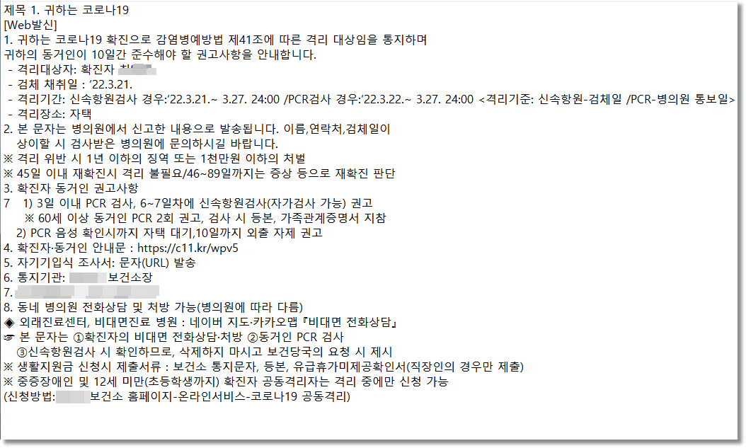 해질무렵 보건소에서 아래와 같은 코로나양성자뫄 가족에 대한 주의사항 메시지가 도착했다.