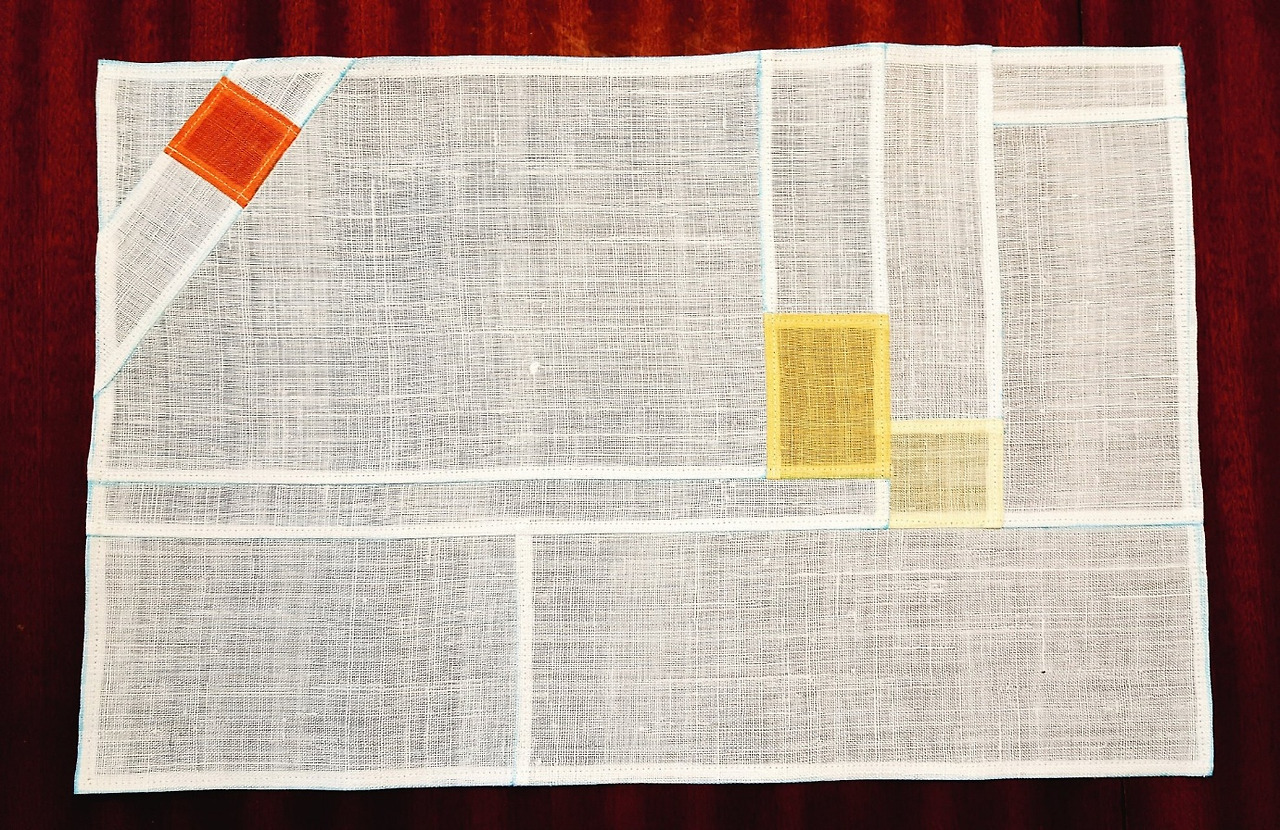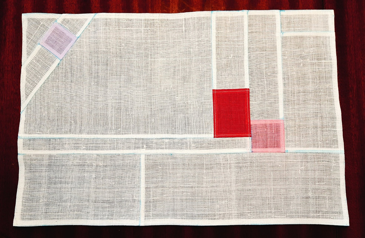 나는 내가 만든 패턴을 이용하여 모시원단의 컬러를 배정하고 자르고 하나하나 이어붙여가며 정성껏 재봉틀을 굴려 조각보를 만든다.