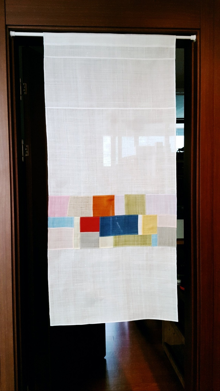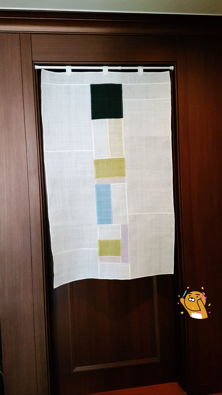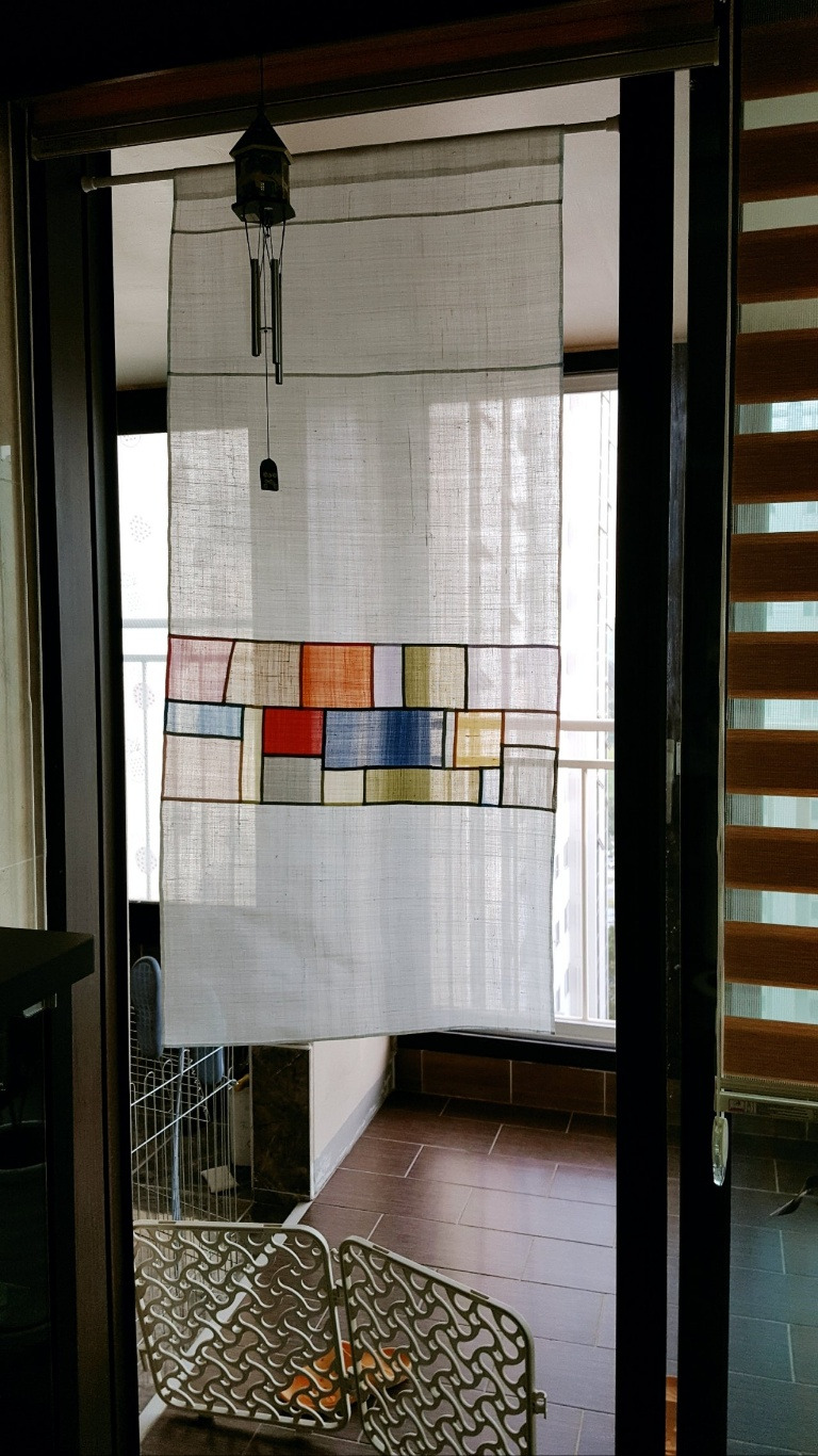 아파트 베란다 창에 드리워보았다. 적당한 바람과 들이치는 빛에 살랑이는 조각보가리개의 효용을 보여준다.