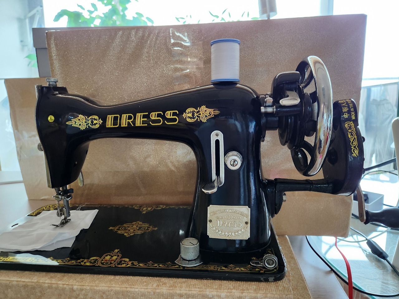 원래는 손잡이가 없이 휠만 있는 미싱으로 생산되었으나, 이 구제미싱을 사들여 리모델링한 전문미싱판매자께서 손잡이(중국산 무쇠라는 점이 아쉽다)를 달고 닦고 조였다고 했다.