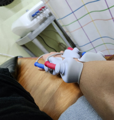 손목에 붙인 동그란압착패드를 통해 전기가 흐르는 동안 근육과 힘줄에 찌릿찌릿 자극이 된다.