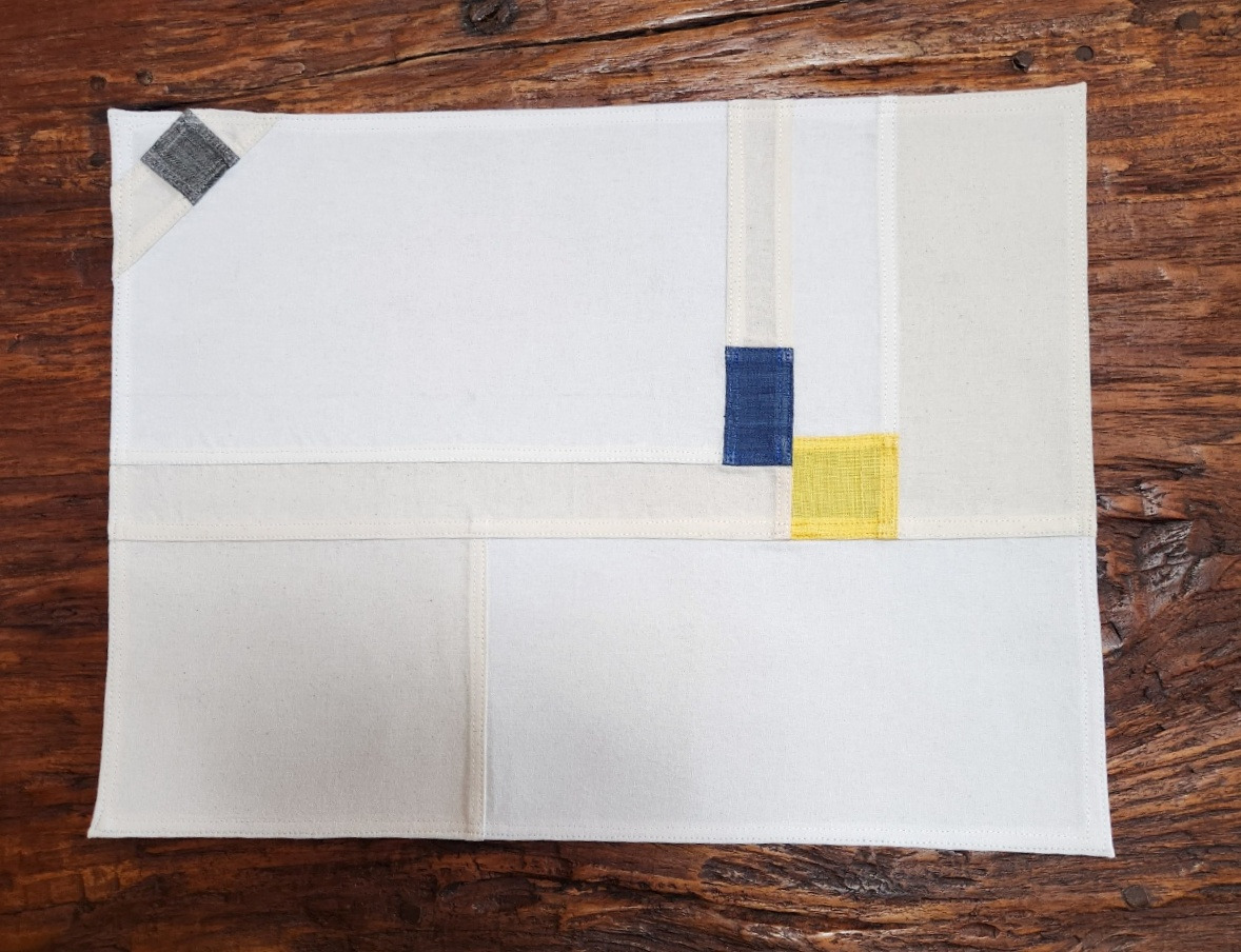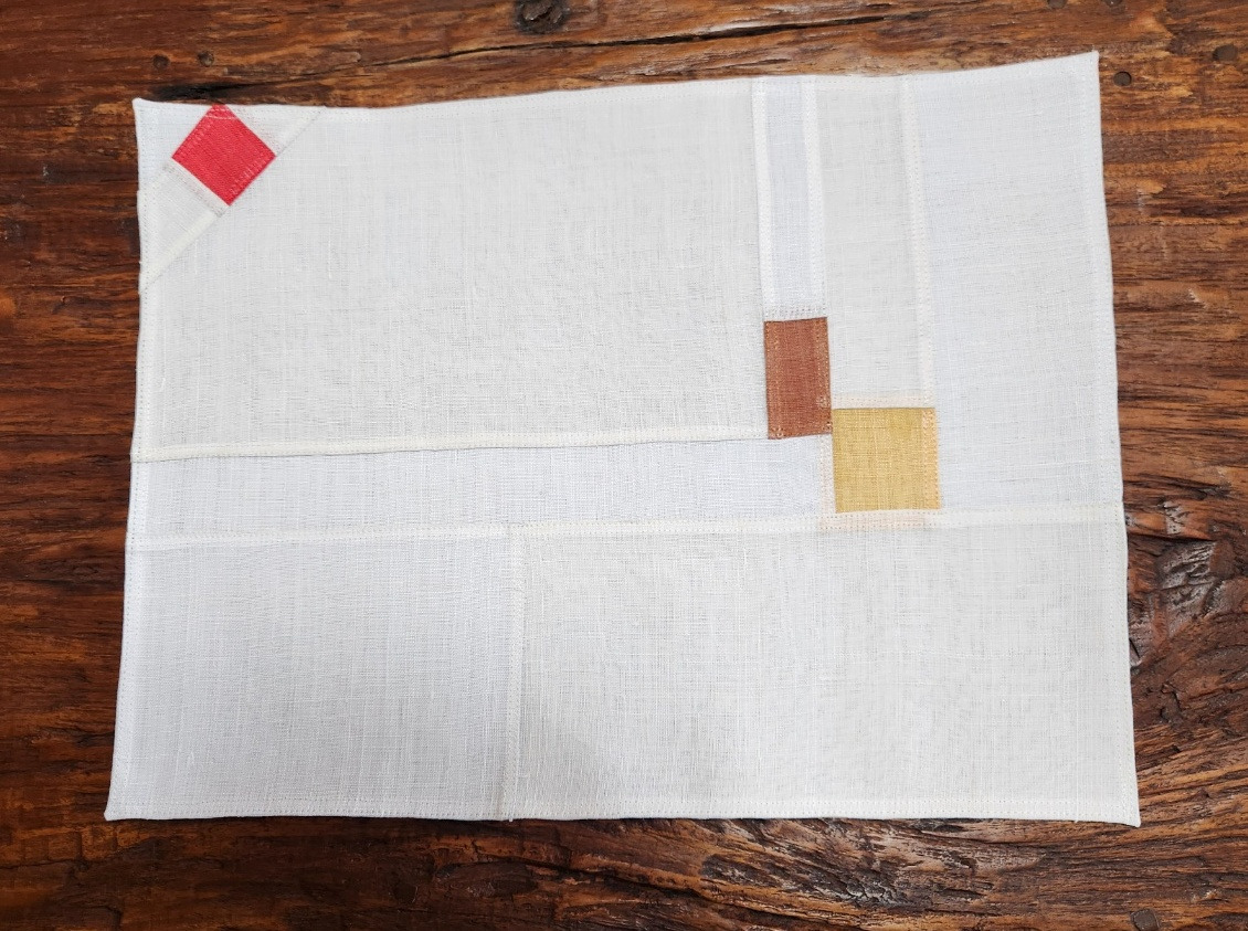 바탕을 모시원단으로 만든 왼쪽 테이블매트: 백색과 내추럴색으로 흰색감의 톤이 다른 것을 섞어 분할하여 붙였다.