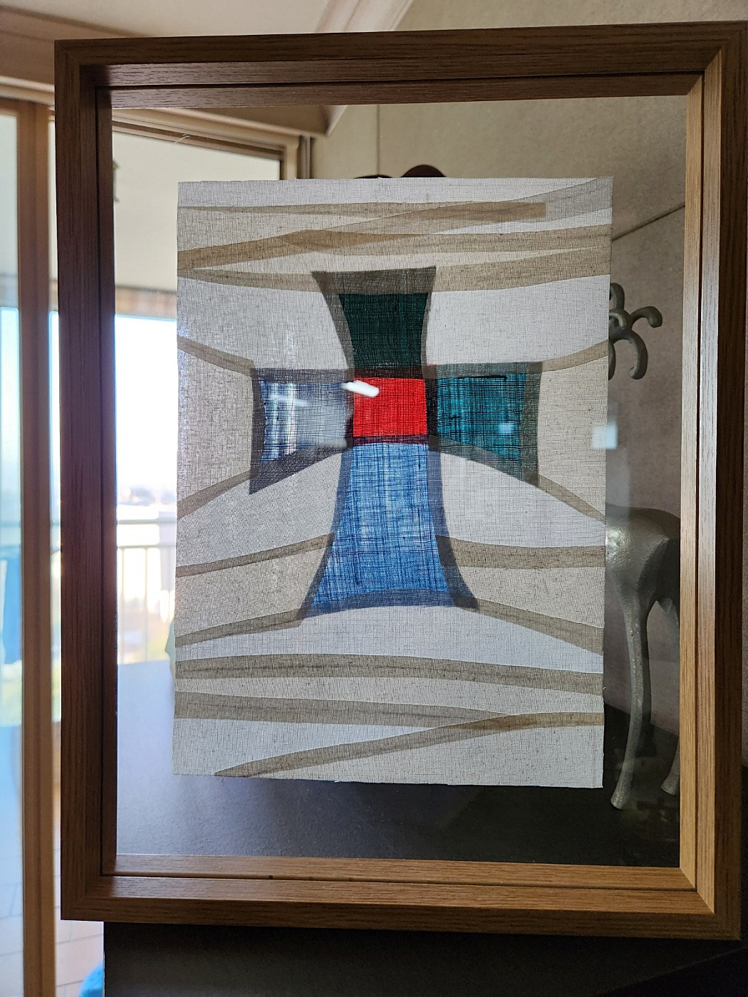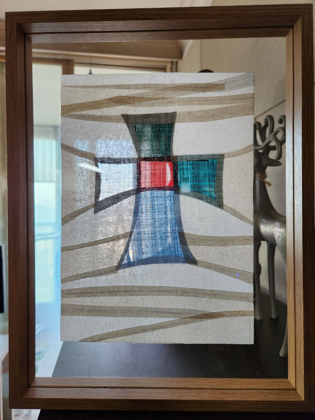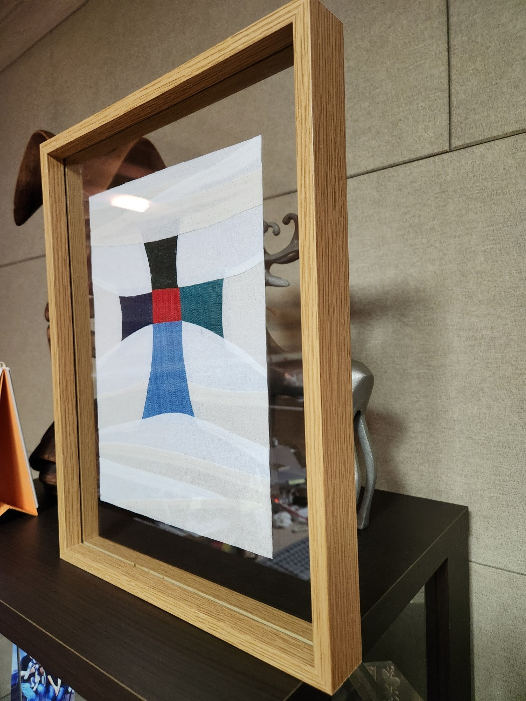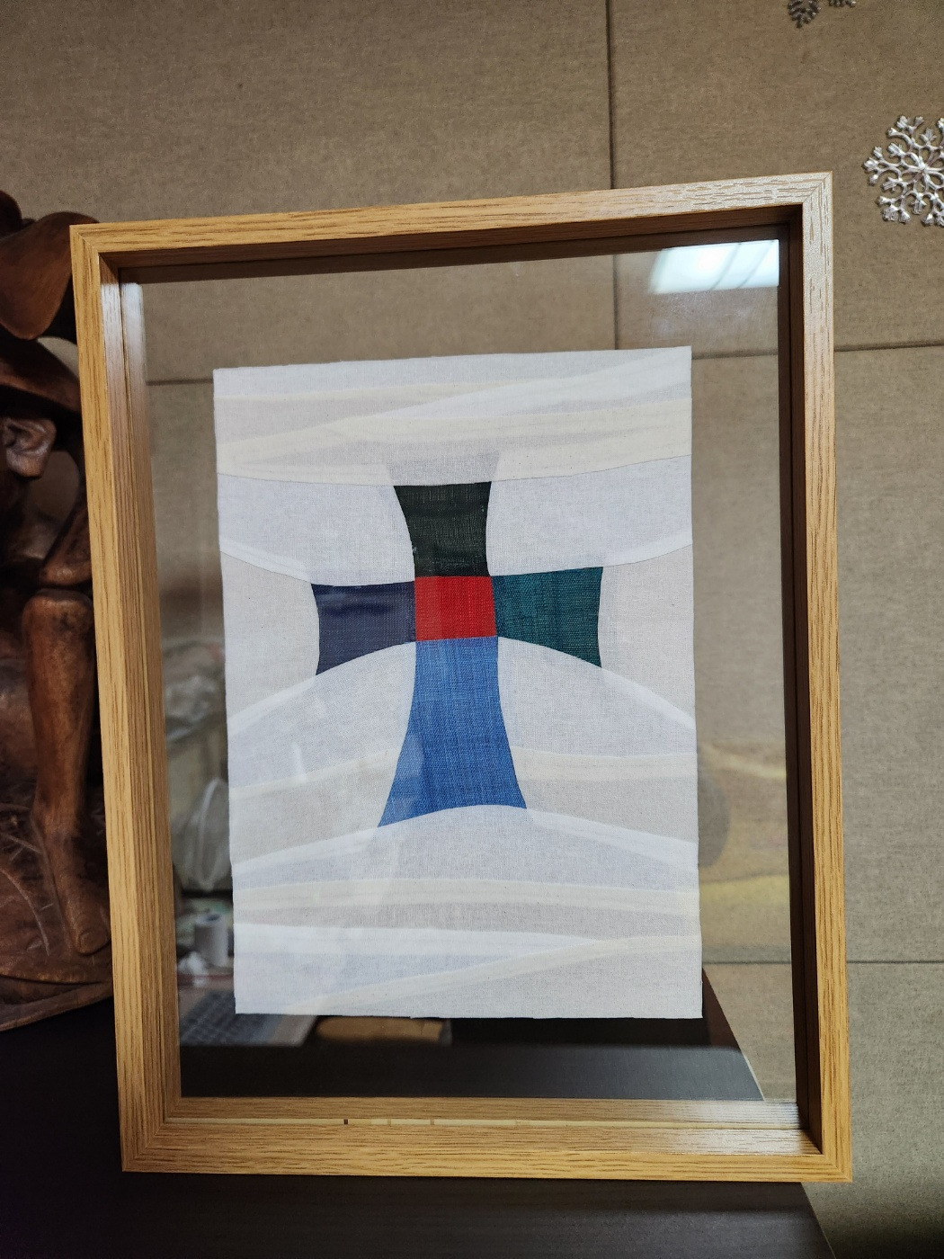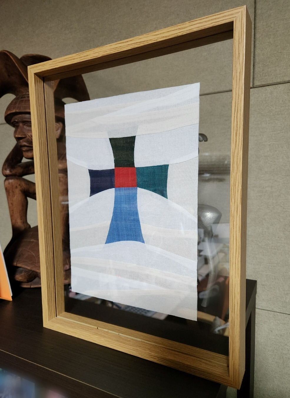중앙의 십자가가 포인트이기에, 컬러 모시 원단으로 각각 잘라 연결하여 완성해야 하는 그 모양이 가장 잘 자리잡도록 하는게 생각만큼 쉽지 않고, 바탕에 쓰인 두가지색 광목원단 역시 기본적으로 조각이 크지 않아서 제자리에 갖다놓아도 쉽게 움직이는 것이다. 또한 원단에 구김이 있어서 예쁘지 않아 풀을 먹여 1차로 다림질을 한 조각들을 이어붙여가며 실행했다.