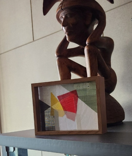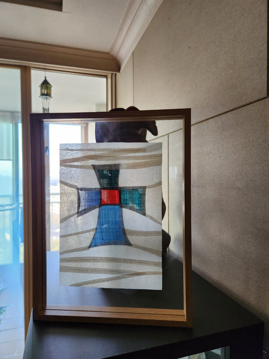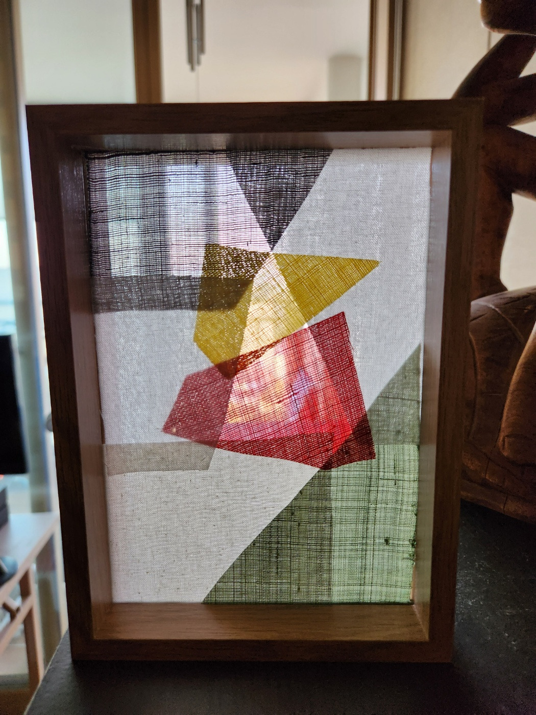 간밤, 액자가 도착하자마자 넣어보았다. 자연 채광이 없어서 조각패턴의 이미지들이 잘 드러나지 않는다.