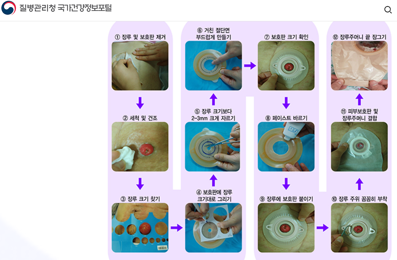 질병관리청 홈페이지에 제시된 장루교체 과정 순서도
